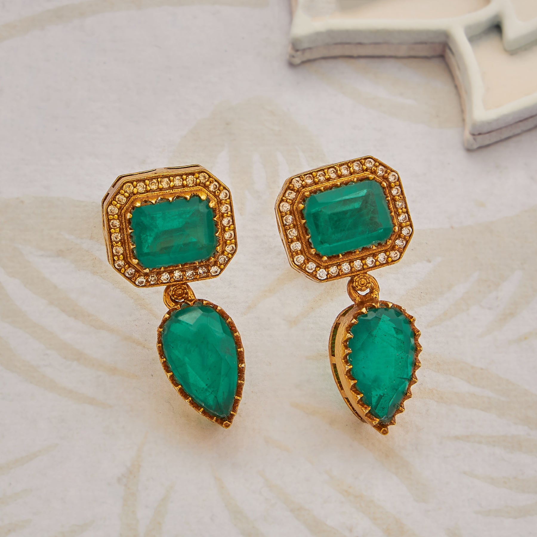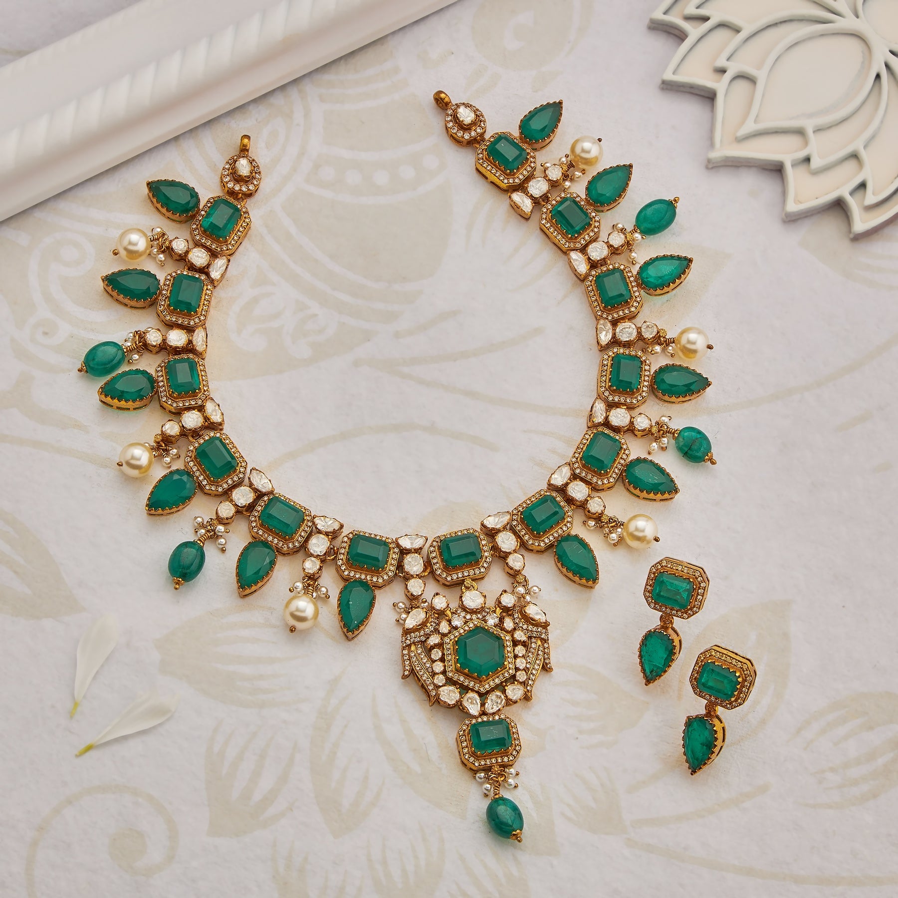 The Heptaflora Necklace Set showcases sophisticated geometric design featuring a striking Heptagon centrepiece adorned with Peacock-inspired detailing. This exquisite piece combines Moissanite and emerald stones with budget-friendly CZ accents for brilliant sparkle and depth. Delicate Green bead and Pearl hangings cascade gracefully, adding movement and elegance to the overall composition. The thoughtful blend of gemstones creates a luminous, multidimensional effect while the verdant accents complement the Peacock motif beautifully. Perfect for those seeking refined craftsmanship with distinctive character, this necklace set delivers both visual impact and wearable sophistication.