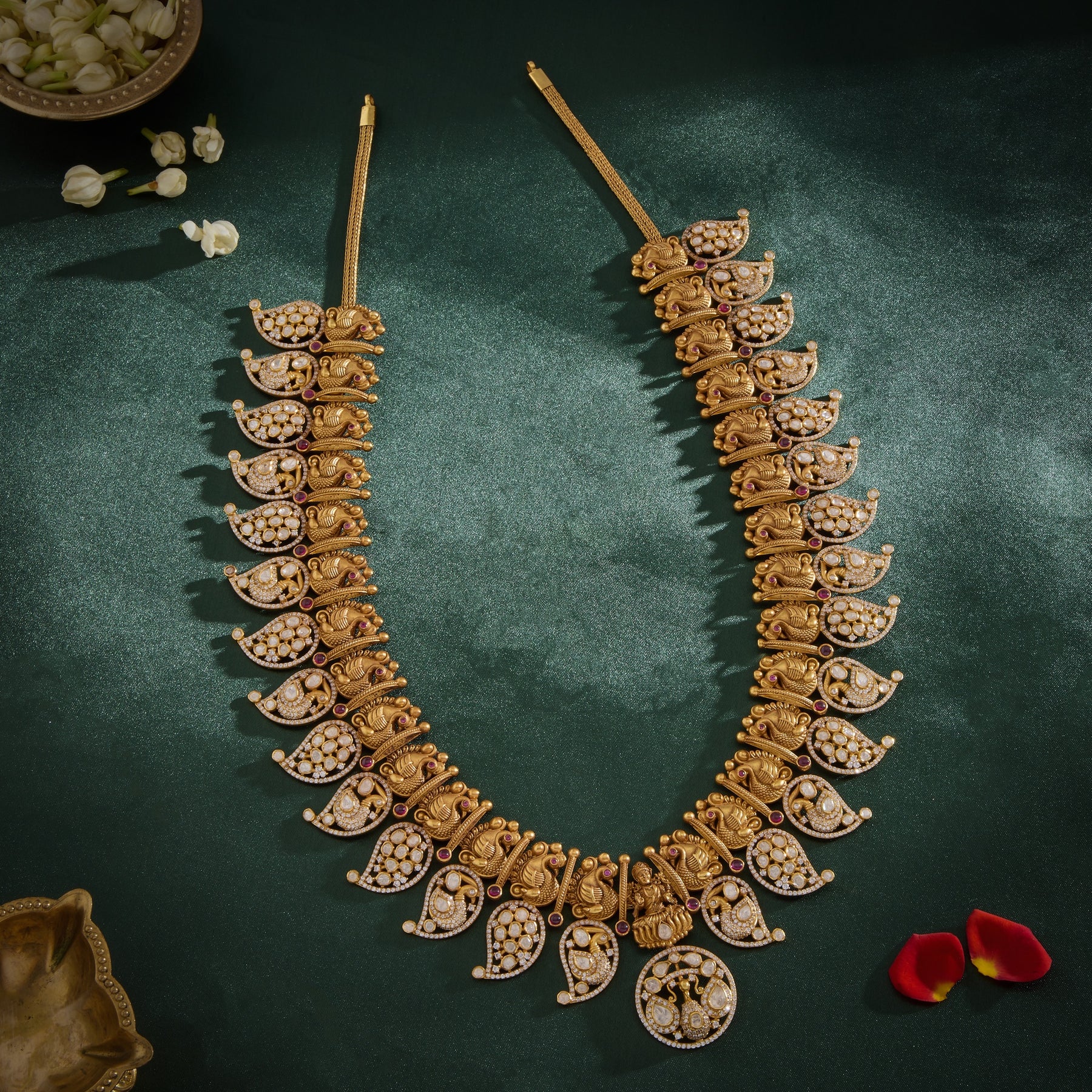 Moissaria Lakshmi Haaram celebrates divine elegance through thoughtful design. This piece features the sacred Lakshmi motif paired with graceful Mango shapes and intricate Peacock detailing—symbols of prosperity and beauty in Indian tradition. Crafted with Moissanites for brilliant sparkle, complemented by rich Ruby accents and sparkling CZ stones, this jewellery combines spiritual significance with contemporary radiance. Perfect for those seeking meaningful adornment that honours heritage while delivering lasting luminosity.