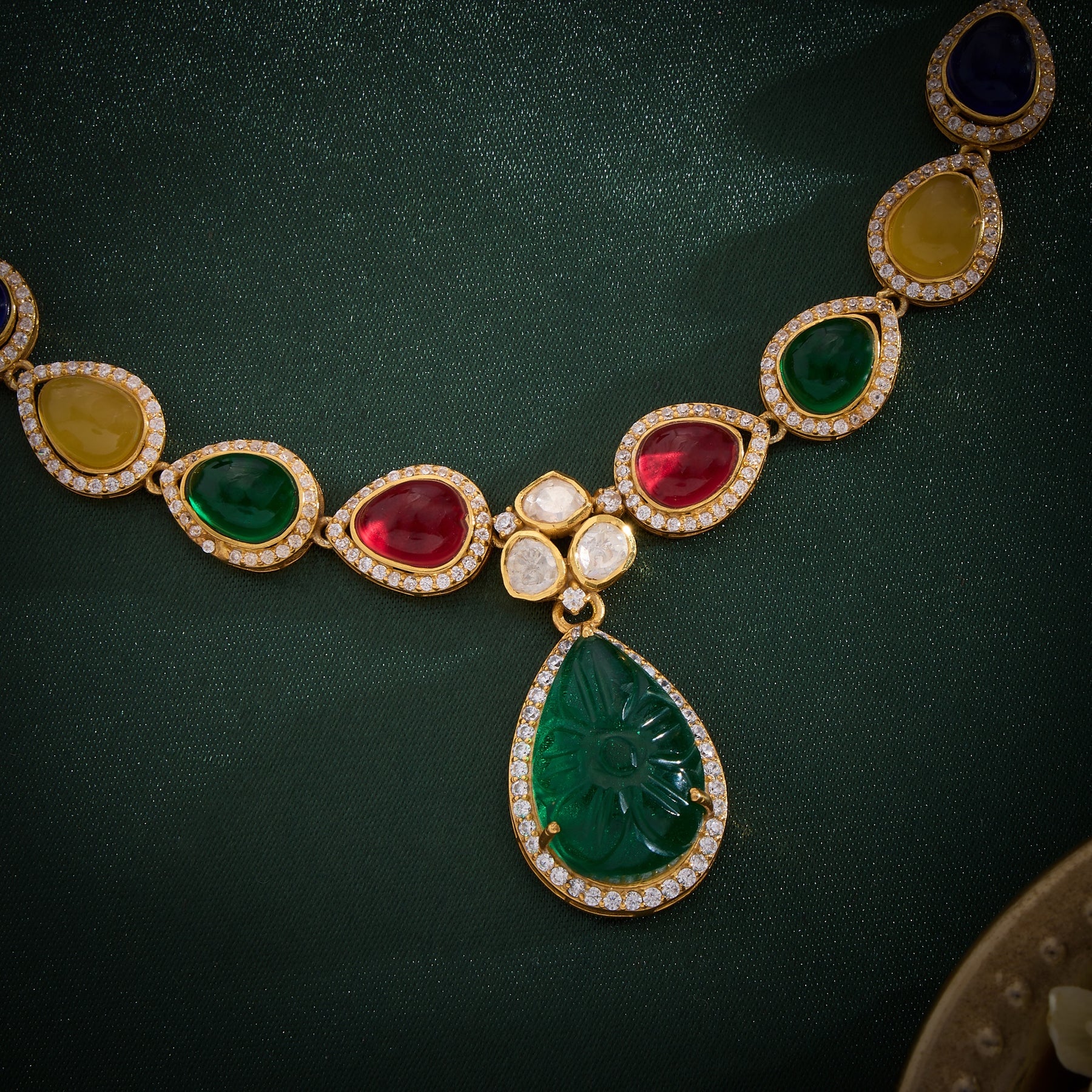 Elevate your spiritual practice with this expertly crafted Nava-Pear Jyothi Necklace Set, featuring a distinctive Pear-shaped Navaratna design. Each of the nine sacred gemstones is thoughtfully represented through Moissanites and CZ stones, meticulously arranged to honour traditional astrological significance. The Pear silhouette adds contemporary elegance while maintaining the authentic essence of symbolism. Perfect for those seeking the combined benefits of all nine planetary influences in a refined, wearable form.