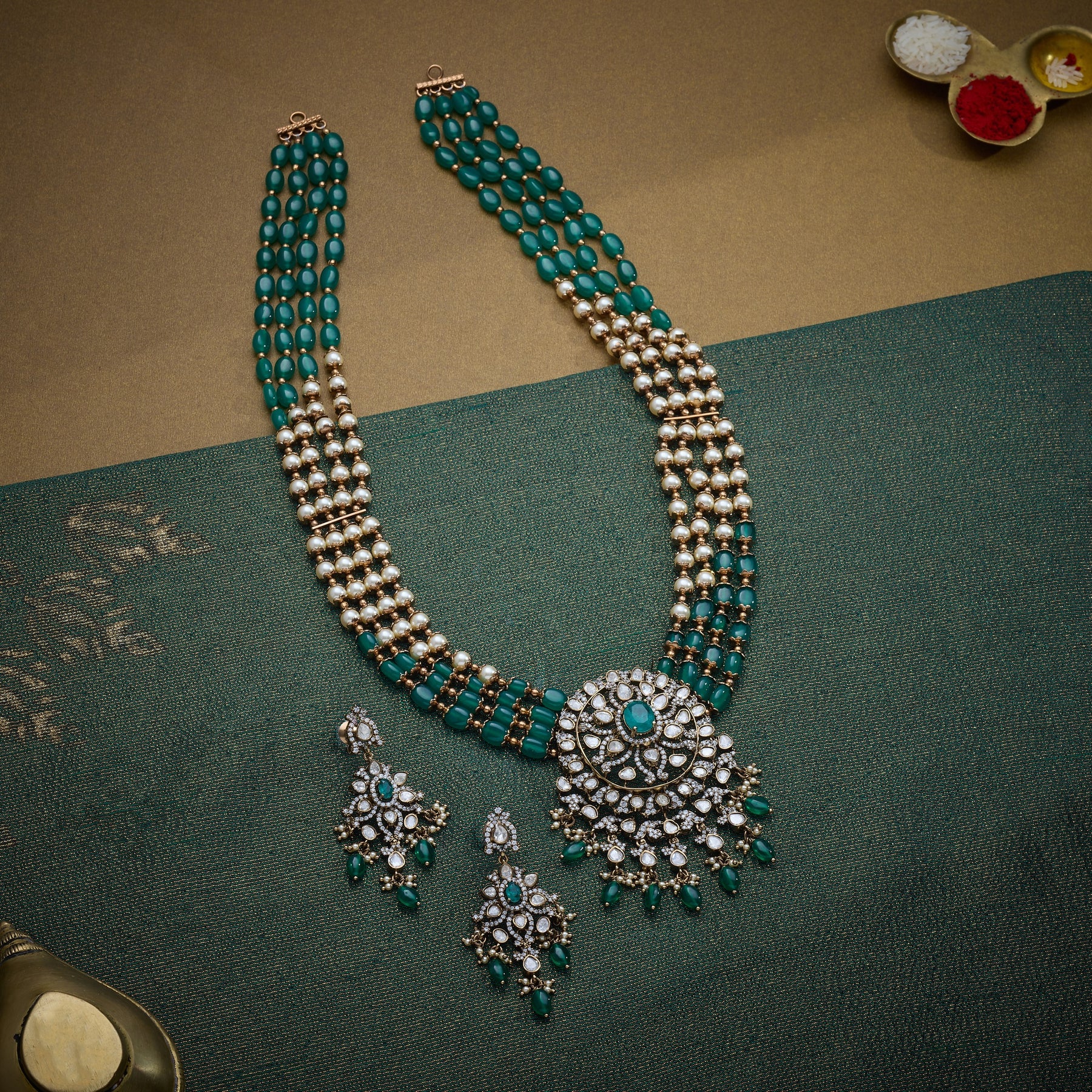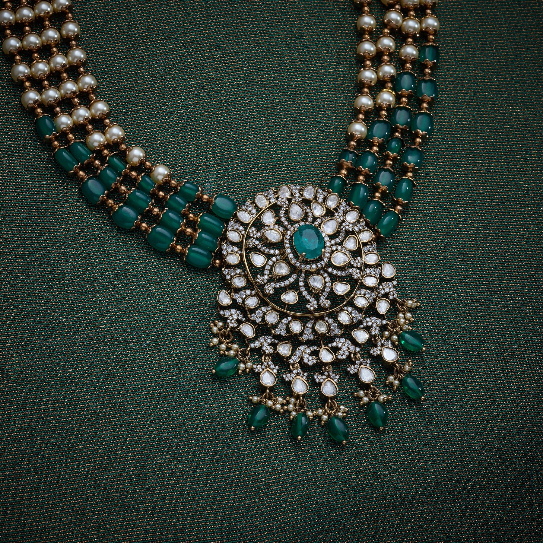 Elevate your collection with the Ovaflora Victorian Necklace Set, a masterpiece blending timeless elegance with contemporary sparkle. This exquisite piece features Oval and Floral motifs adorned with brilliant CZ stones, luminous moissanite, and rich emerald accents. Delicate Green bead and Pearl hangings cascade gracefully, while a coordinating beaded chain in Green beads and Pearls completes the sophisticated design. Perfect for special occasions wear, this necklace set showcases expert craftsmanship and luxurious detailing that captures light beautifully from every angle.