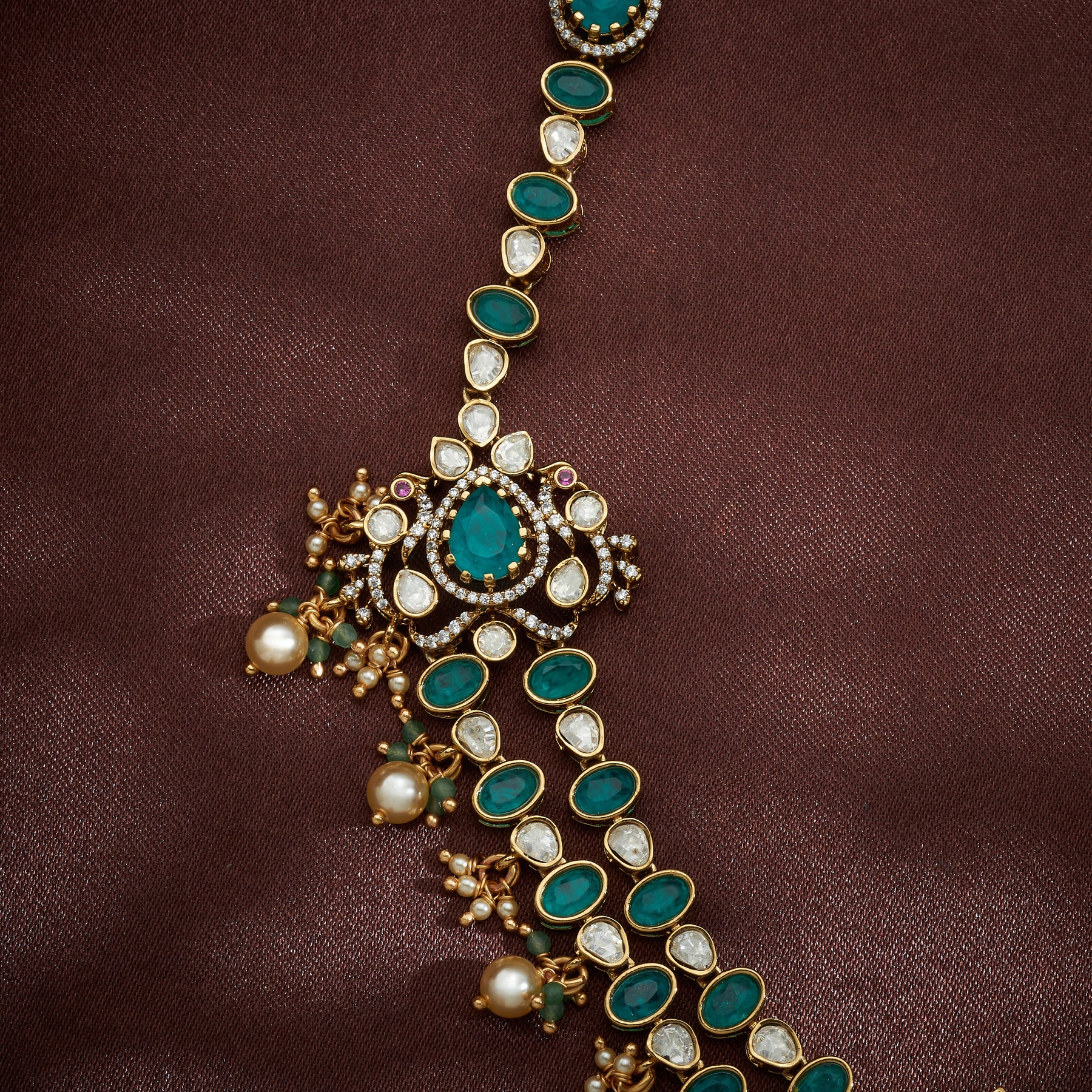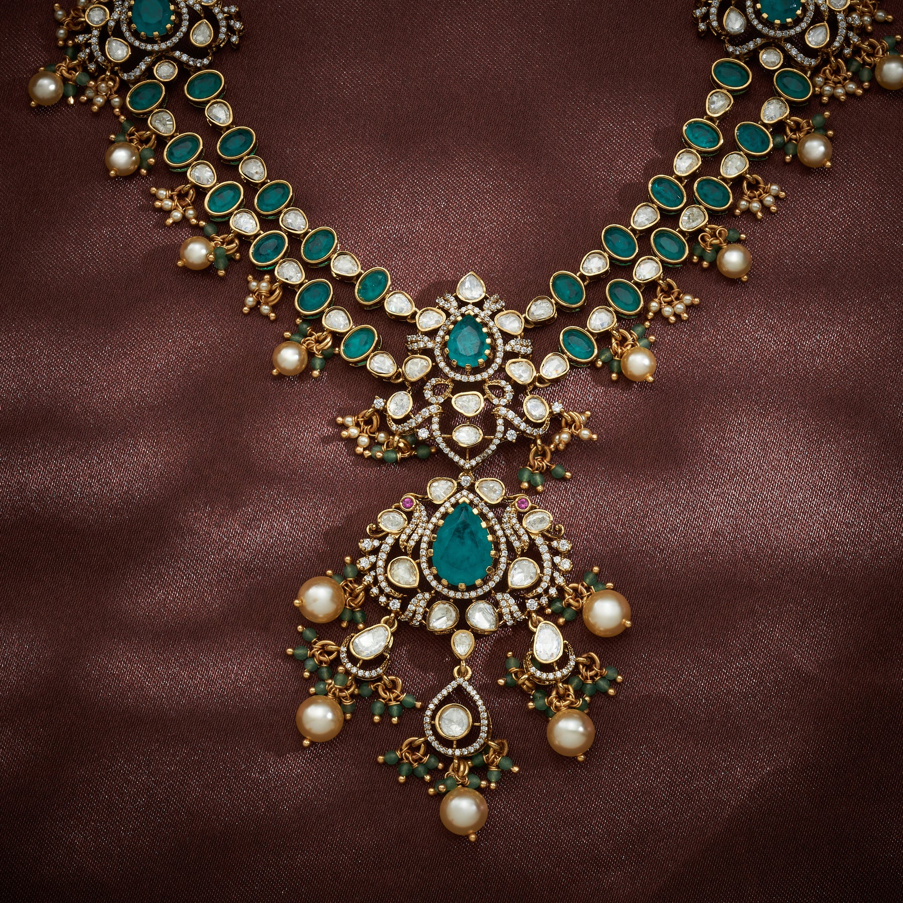 Padmamora Necklace Set showcases intricate artisanal craftsmanship with a sophisticated design narrative. The piece features ornate Floral motifs and majestic Peacock embellishments, complemented by delicate Pear-shaped elements that enhance its visual depth. Premium materials including CZ stones, Moissanite, and Emeralds create a luminous interplay of light and colour, while cascading Pearl and Green bead hangings add graceful movement and traditional elegance. This versatile set transitions seamlessly from festive occasions wear, offering timeless appeal with contemporary design sensibilities.