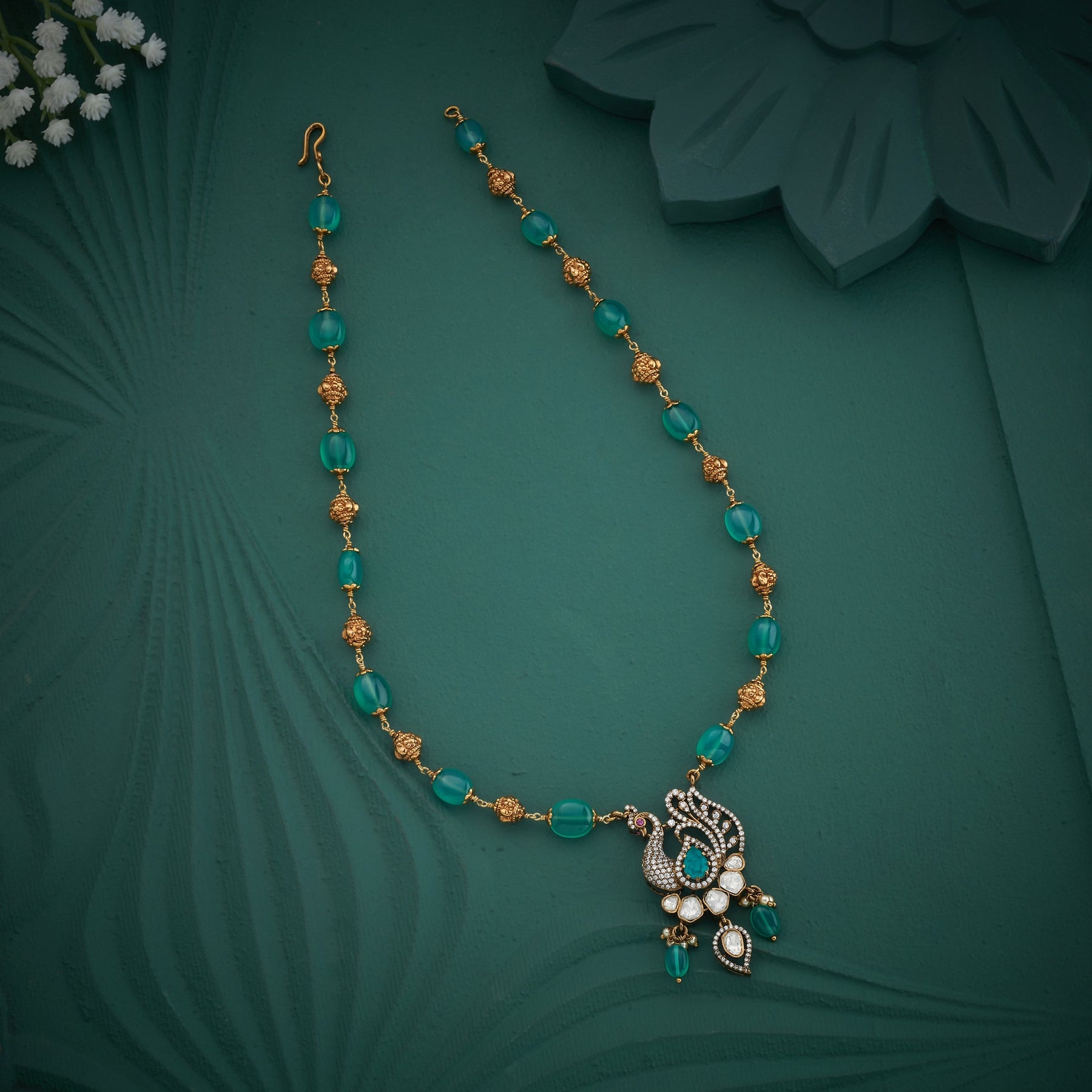 Elevate your jewellery collection with the Pavo Victorian Necklace, a stunning piece that seamlessly blends timeless elegance with contemporary design. Adorned with intricate Peacock motifs and embellished with brilliant CZ stones and Moissanite, this necklace captures light beautifully from every angle. The rich green stones complement the ornate detailing, while cascading green bead hangings and a luxurious Golden-beaded chain add movement and sophistication. Perfect for special occasions or as a statement piece for the discerning jewellery lover, this Victorian-inspired creation brings refined glamour to any ensemble.