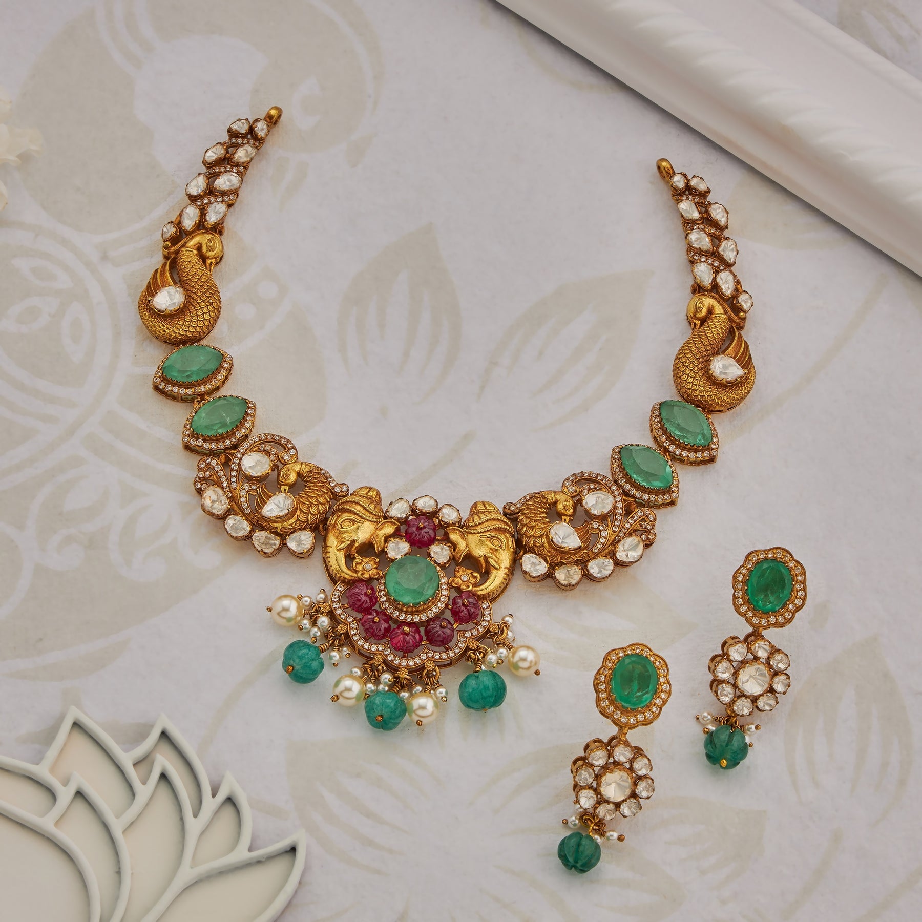The Peaflora Necklace Set showcases intricate artistry with Peacock and Floral motifs adorned with brilliant Moissanite, Emeralds, and Rubies. Each piece features elegant Green bead and Pearl hangings that add movement and sophistication. The combination of semi precious gemstones and lustrous Pearls creates a refined aesthetic, perfect for elevating both traditional and contemporary ensembles. This expertly crafted set delivers timeless elegance with striking visual depth, making it an exceptional choice for special occasions or discerning collectors.