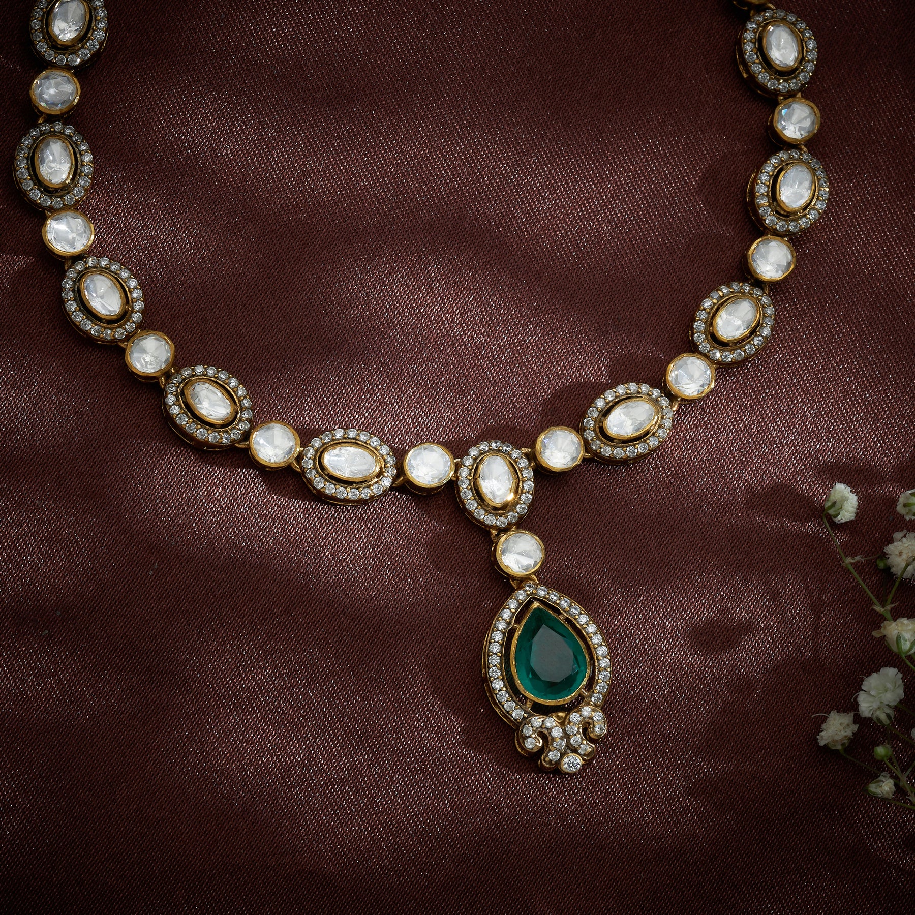 Elevate your jewellery collection with the Pearline Victorian Necklace Set, a sophisticated piece that combines timeless elegance with contemporary design. Featuring a striking Pear-shaped centerpiece complemented by an Oval silhouette, this necklace showcases a harmonious blend of premium materials. Adorned with brilliant CZ stones, lustrous moissanite, and a vibrant Emerald accent, each element is carefully selected to create a captivating interplay of light and colour. The expert craftsmanship ensures durability and lasting brilliance, making this set an ideal choice for special occasions wear.