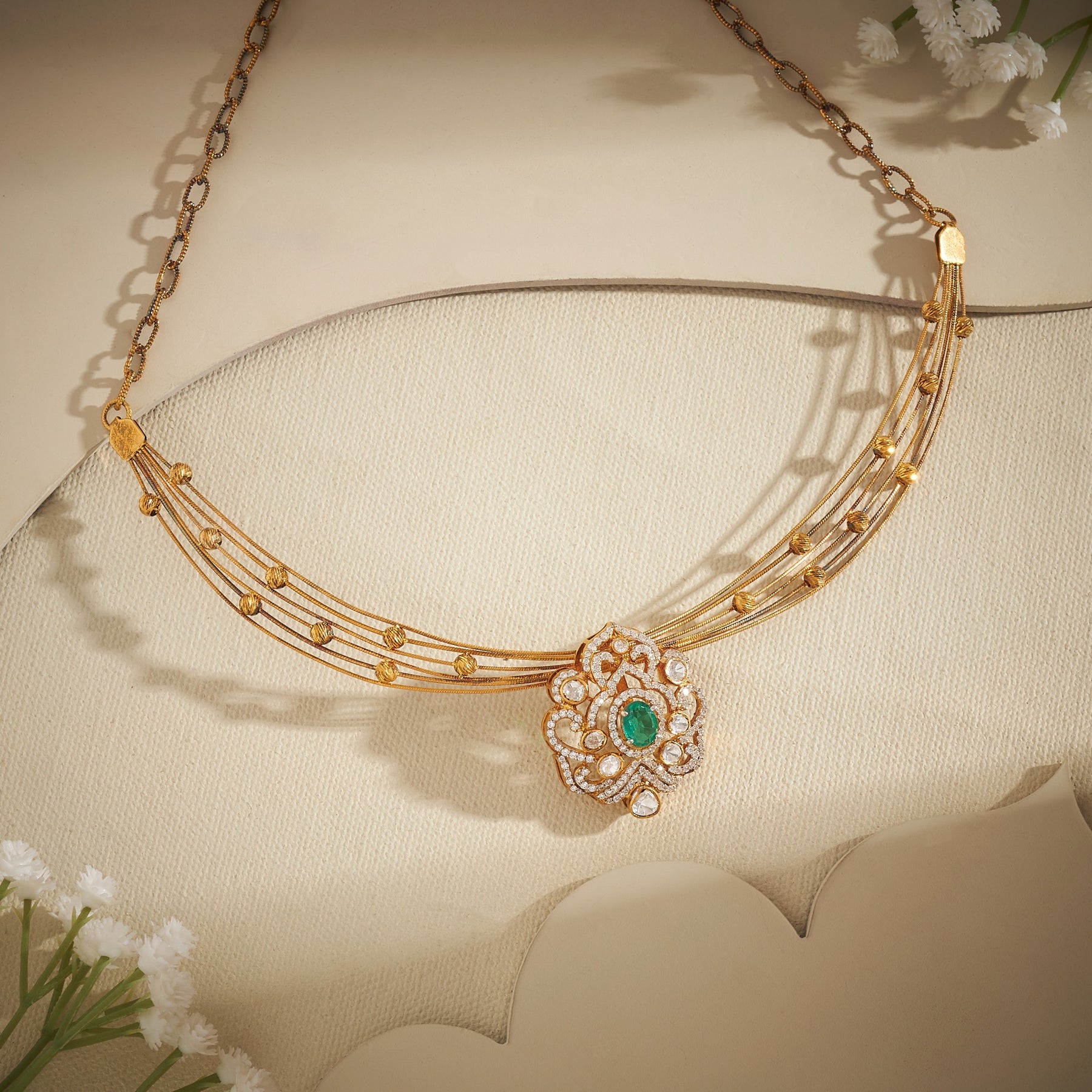 Introducing the Pear Fleur Victorian Kanti, a sophisticated piece that seamlessly blends timeless elegance with contemporary design. Adorned with delicate Floral motifs, this Kanti features a harmonious arrangement of sparkling CZ stones paired with rich Green stones that evoke natural beauty and grace. The intricate detailing captures the essence of Victorian craftsmanship while the verdant accents add a refreshing, modern touch. Perfect for those who appreciate refined jewellery that tells a story of artistry and refinement.