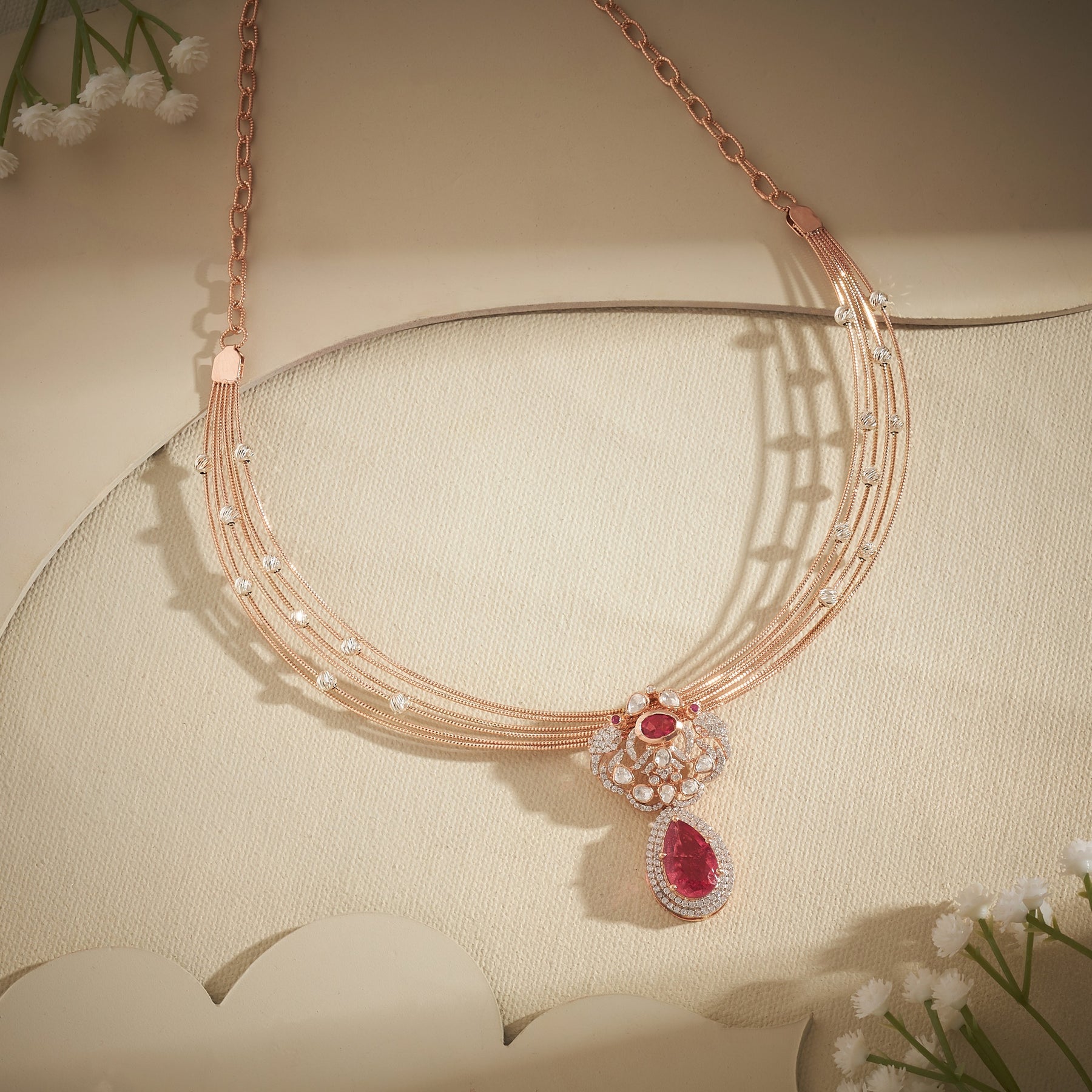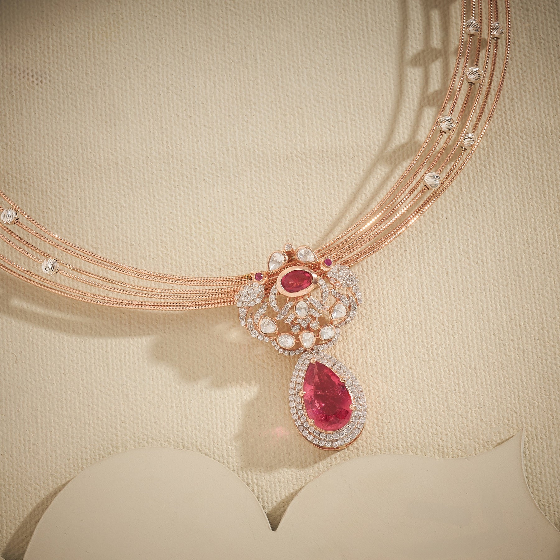 Pear of Fire Victorian Kanti Embrace timeless elegance with this sophisticated Victorian-inspired piece, meticulously crafted to capture the essence of refined luxury. Adorned with intricate Parrot and Pear motifs, this design seamlessly blends nature-inspired artistry with ornamental grandeur. Sparkling Cubic Zirconia stones provide brilliant luminosity, while a striking Red stone serves as the focal point, evoking passion and opulence. Each detail reflects masterful craftsmanship, making this an exquisite addition to your heirloom collection.