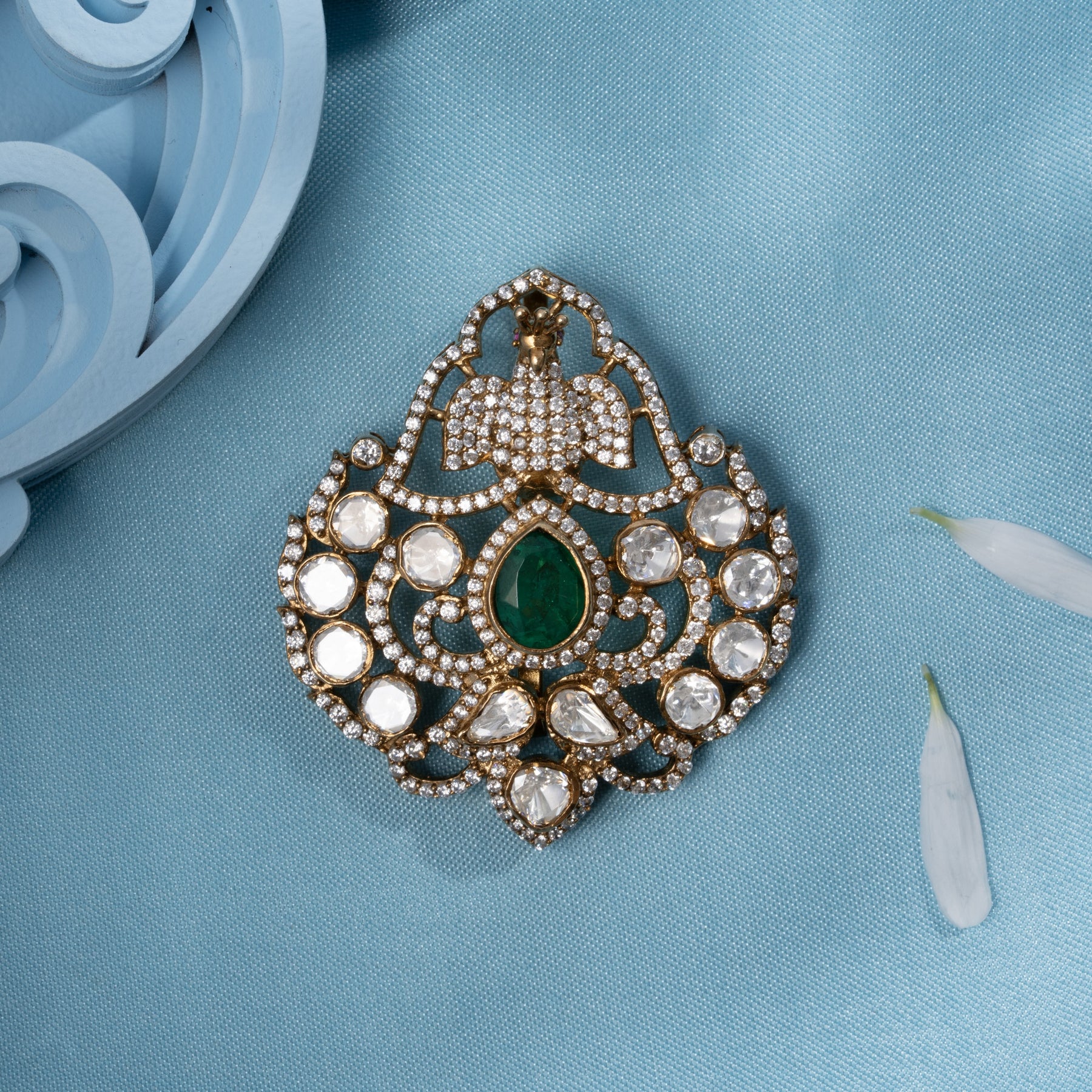 Plumes Victorian Pendant captures timeless elegance with its distinctive Peacock design and graceful Pear-shaped silhouette. Adorned with lush Green stone and sparkling CZ accents complemented by brilliant Moissanites, this piece radiates refined sophistication. The intricate detailing evokes Victorian artistry while the luminous gemstones create an enchanting interplay of light. Perfect for those who appreciate ornate jewellery with contemporary brilliance, this pendant makes a striking statement for special occasions wear.