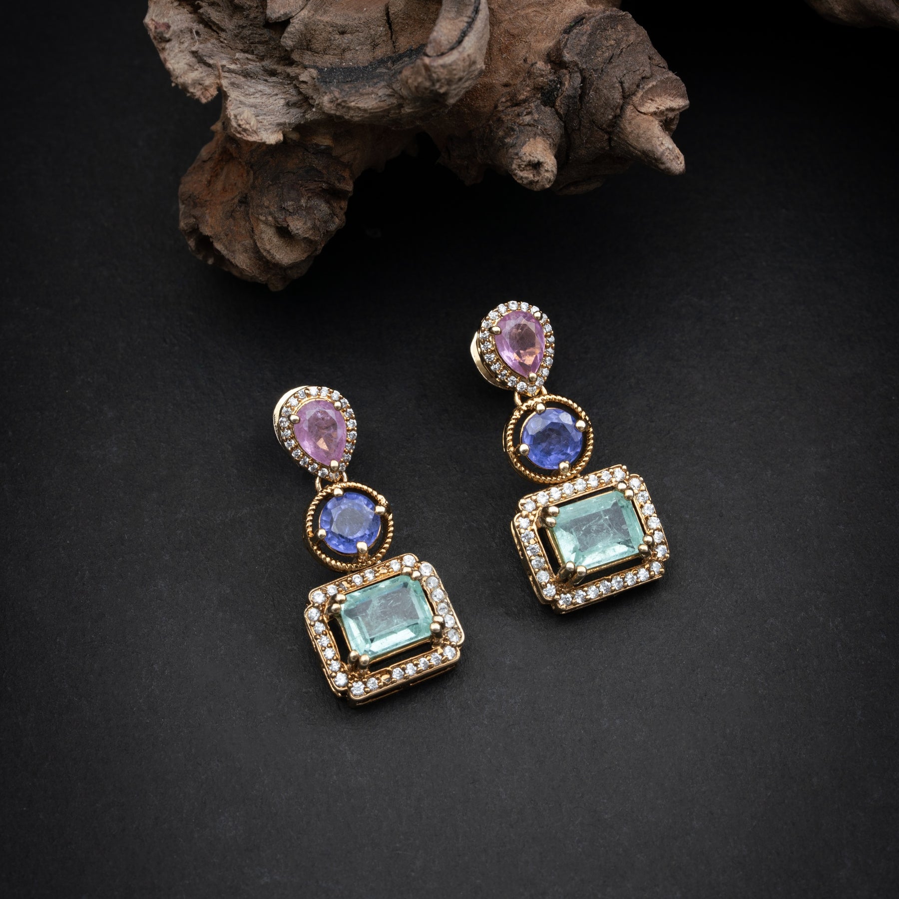 This stunning necklace set features a unique design, combining Pear and Rectangle-shaped stones of Emerald, Pink Sapphire, and Tanzanite. The tricolour combination adds a touch of vibrancy to your look. Perfect for any formal event, this necklace set is the perfect accessory to make a statement.