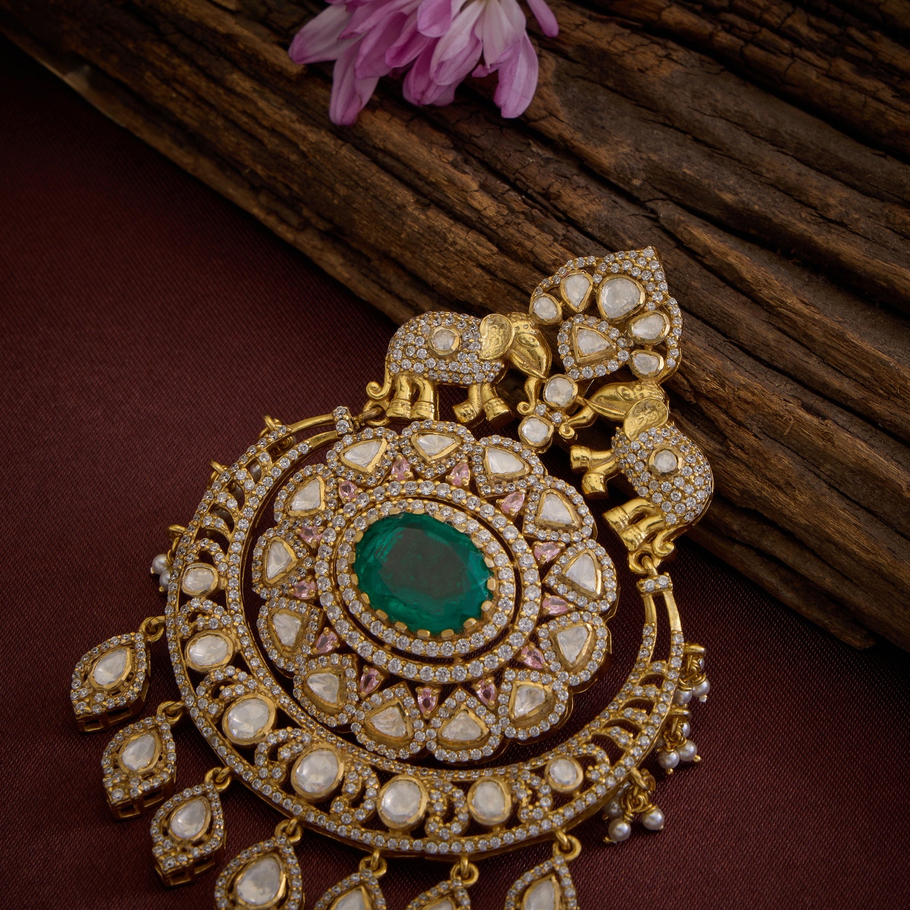 The Regency Tusk Pendant showcases an exquisite design inspired by classical elegance, featuring intricately carved Oval motifs adorned with majestic Elephant details. This sophisticated piece combines premium CZ stones, brilliant Moissanite, and rich Emerald accents to create a striking focal point. Delicate Pearl hangings cascade gracefully from the pendant, adding movement and refinement to the overall composition. Crafted for those who appreciate timeless artistry and fine gemstone work, this pendant merges traditional craftsmanship with contemporary luxury, making it an ideal choice for special occasions.