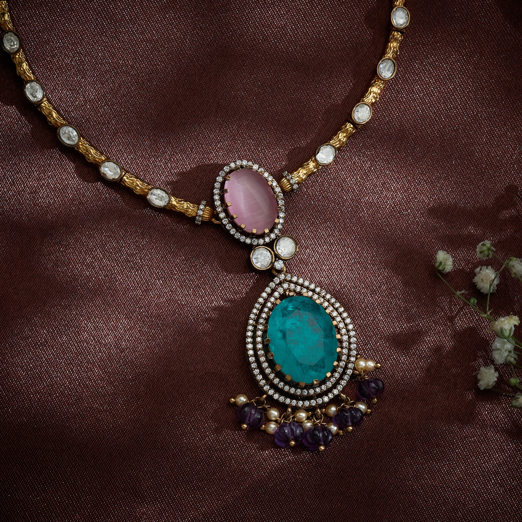 Elevate your collection with the Rosamint Necklace Set, a sophisticated piece that seamlessly blends timeless elegance with contemporary design. Featuring an Oval centrepiece adorned with brilliant CZ stones, Rose Quartz, Moissanite, and Emeralds, this necklace showcases exceptional craftsmanship. Delicate hangings of intricately carved Purple beads and lustrous Pearls add movement and depth, creating a captivating interplay of light and texture. Perfect fo special occasions, this versatile set delivers luxury without compromise.