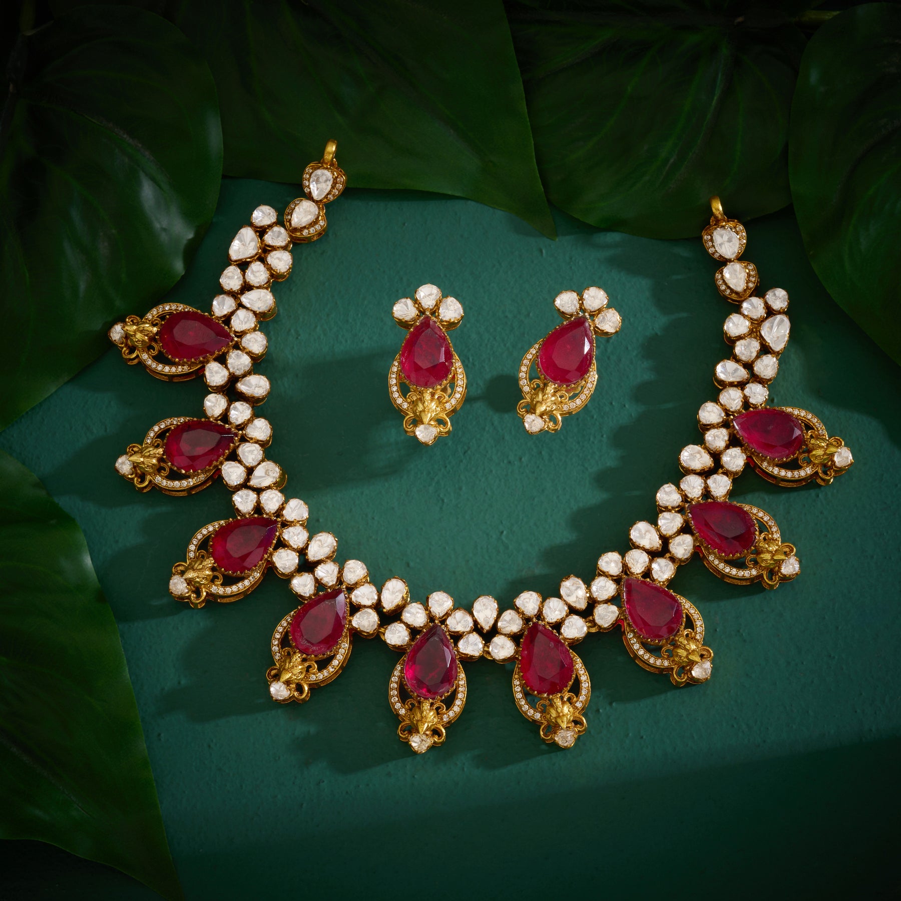 The Rosetta Vaanya Necklace Set combines timeless elegance with contemporary design. Featuring a graceful Pear-shaped centrepiece adorned with delicate Floral motifs, this set showcases a sophisticated blend of Rubies, Moissanite, and Cubic Zirconia stones. The carefully curated gemstone combination delivers brilliant sparkle and rich colour depth, while the expert craftsmanship ensures lasting beauty. Perfect for special occasions, this versatile set offers luxury appeal with refined versatility.