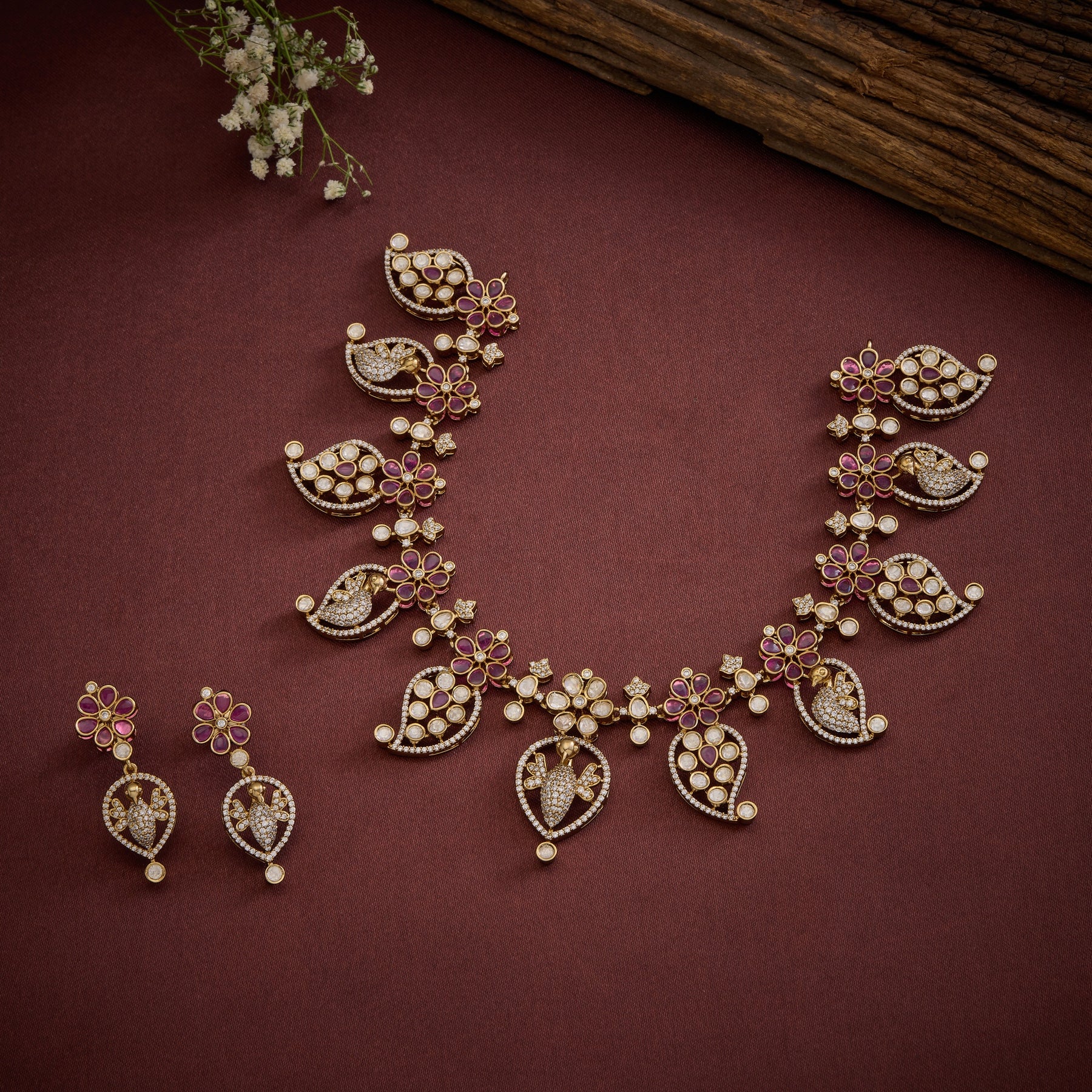 The Rosmangé Necklace Set combines the warmth of Mango-inspired design with sophisticated gemstone craftsmanship. This elegant collection features Moissanite for brilliant sparkle, Cubic Zirconia for versatile radiance, and delicate Pink stones that add a romantic dimension. Each piece is thoughtfully designed to capture light beautifully while maintaining the timeless appeal of traditional aesthetics. Perfect for those who appreciate fine jewellery that blends contemporary brilliance with classic elegance.