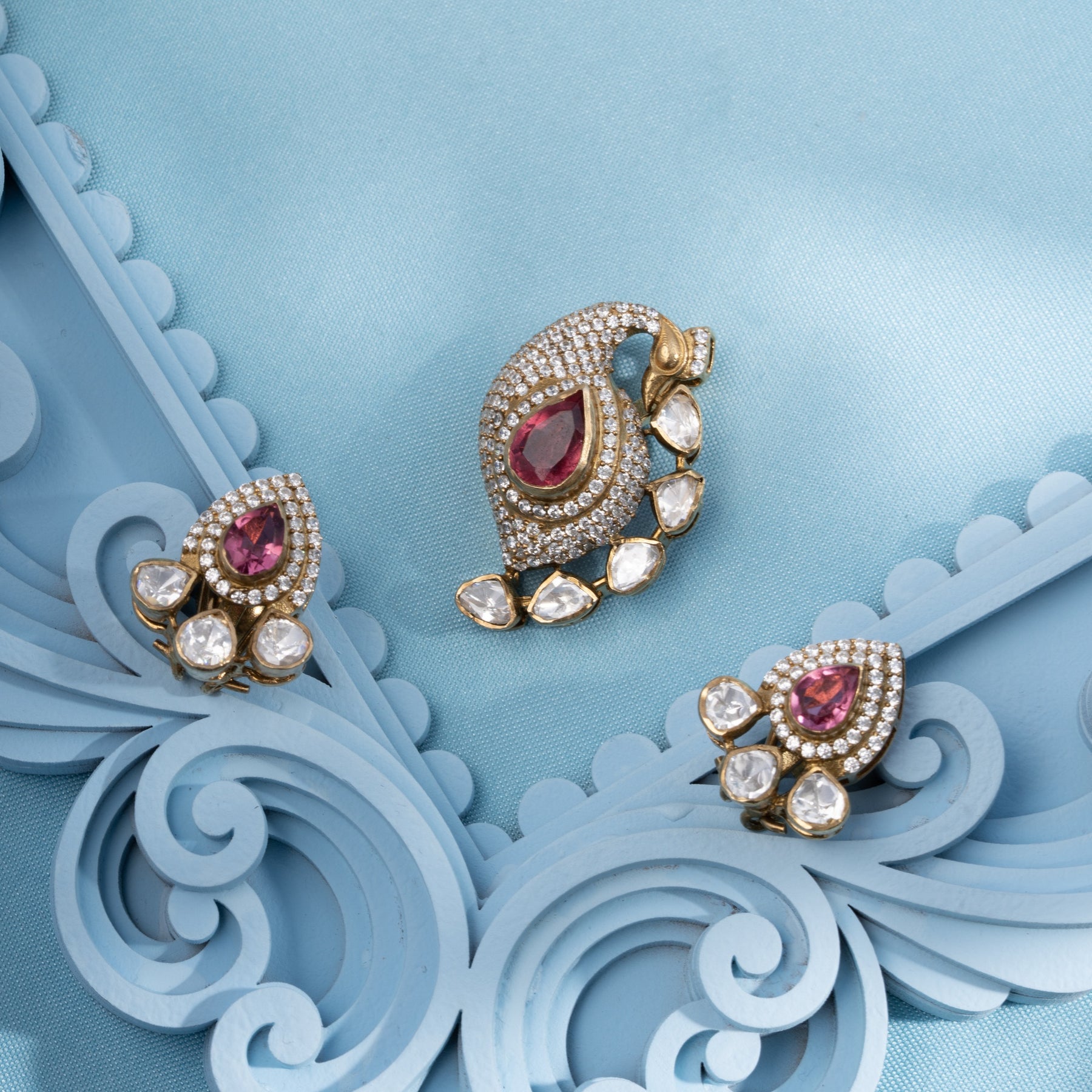 Discover refined elegance with this captivating Victorian pendant set, showcasing a graceful Peacock silhouette adorned with a luminous Pear-shaped Pink stone. Intricate detailing features radiant CZ stones and Moissanites that dance around the Pear centerpiece, creating an enchanting interplay of light and color. This sophisticated design celebrates the majesty of nature while maintaining an air of timeless glamour. Ideal for the discerning wearer who seeks a statement piece that balances ornate artistry with understated grace, this pendant set elevates any ensemble with its distinctive charm and prismatic brilliance.