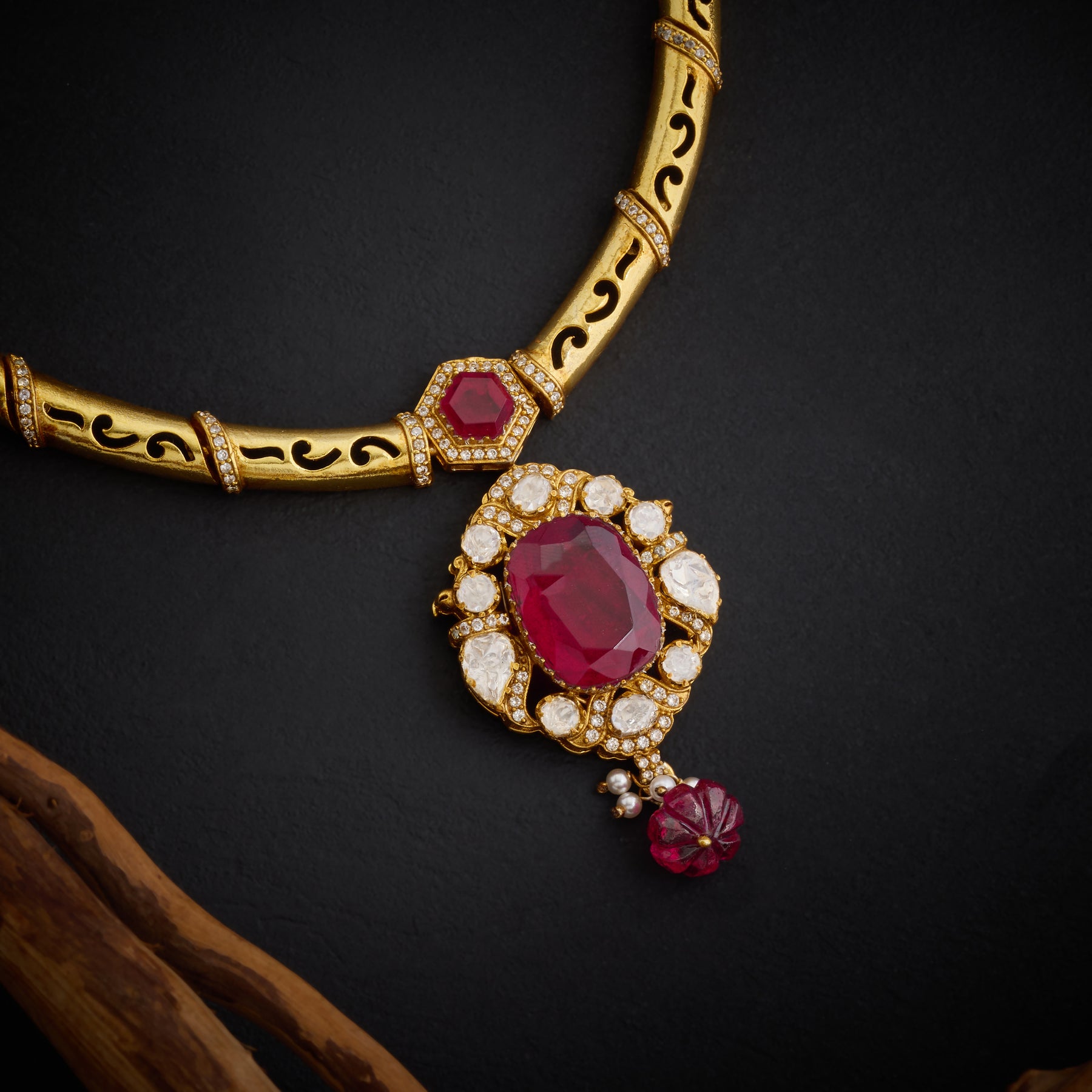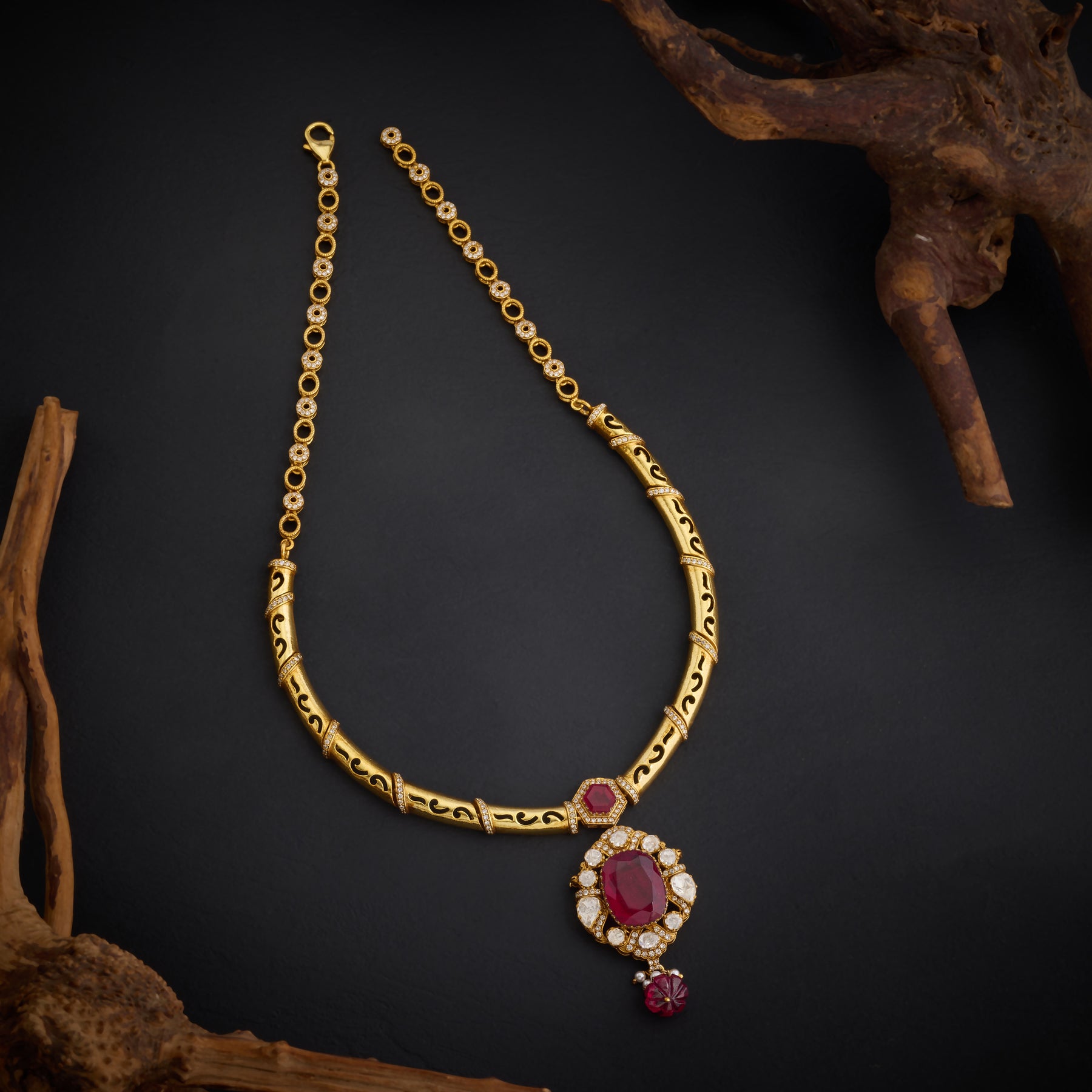 Ruby Oval Victorian Kanti Embrace timeless elegance with this exquisite Victorian-inspired piece. Featuring a striking Oval centerpiece adorned with lustrous Moissanite, complemented by rich Red stones and sparkling Cubic Zirconia accents. Delicate Red bead hangings cascade gracefully, adding movement and dimension to this sophisticated design. Perfect for those who appreciate classical aesthetics with a contemporary edge, this kanti combines heritage craftsmanship with refined luxury.