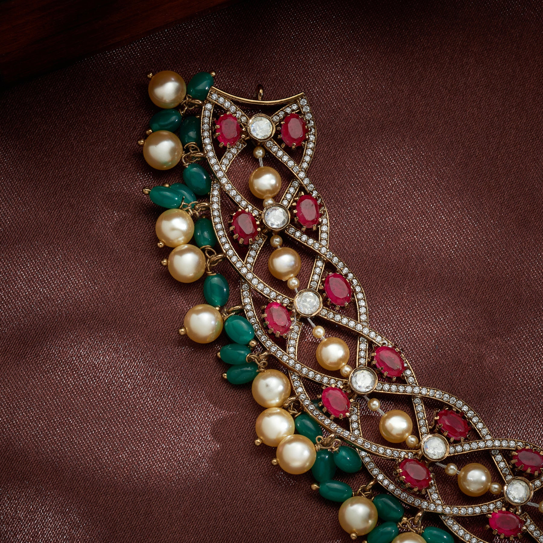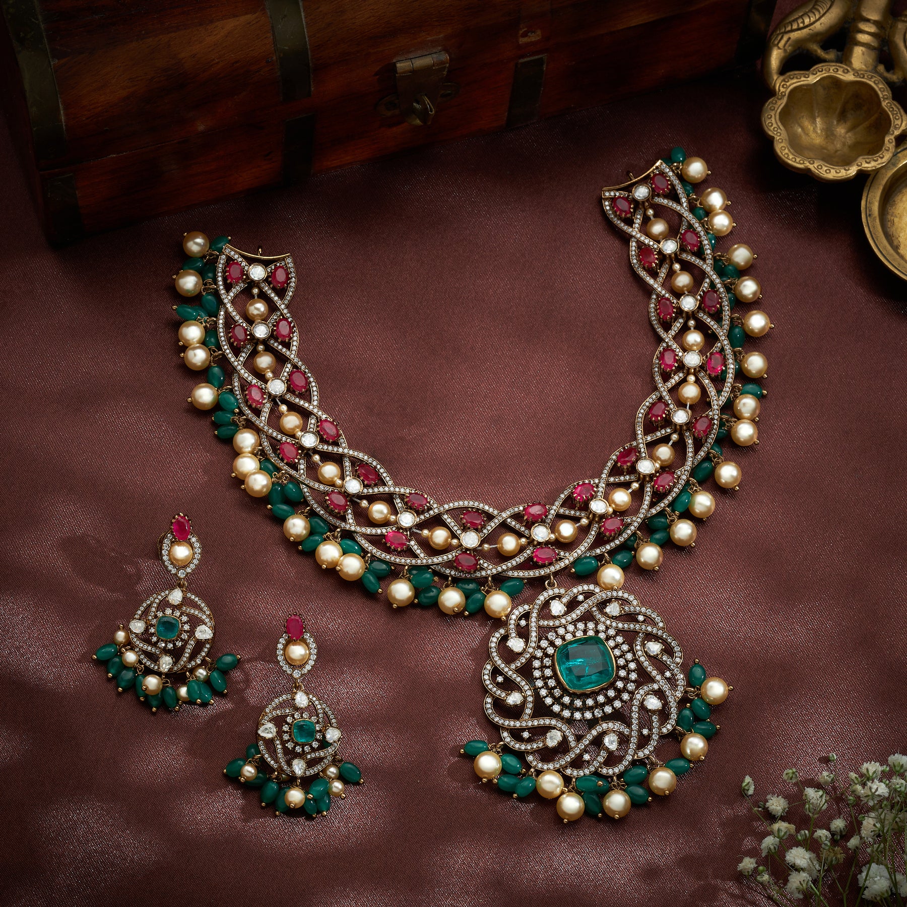 Rukmara Necklace Set combines traditional craftsmanship with refined elegance. This exquisite piece features a stunning Emerald centre stone complemented by vibrant Rubies, all set within an intricate Floral design adorned with sparkling CZ stones and Moissanite accents. Delicate Pearl and Green bead hangings add graceful movement and depth to the composition. Perfect for special occasions, this necklace set showcases meticulous attention to detail and timeless sophistication.