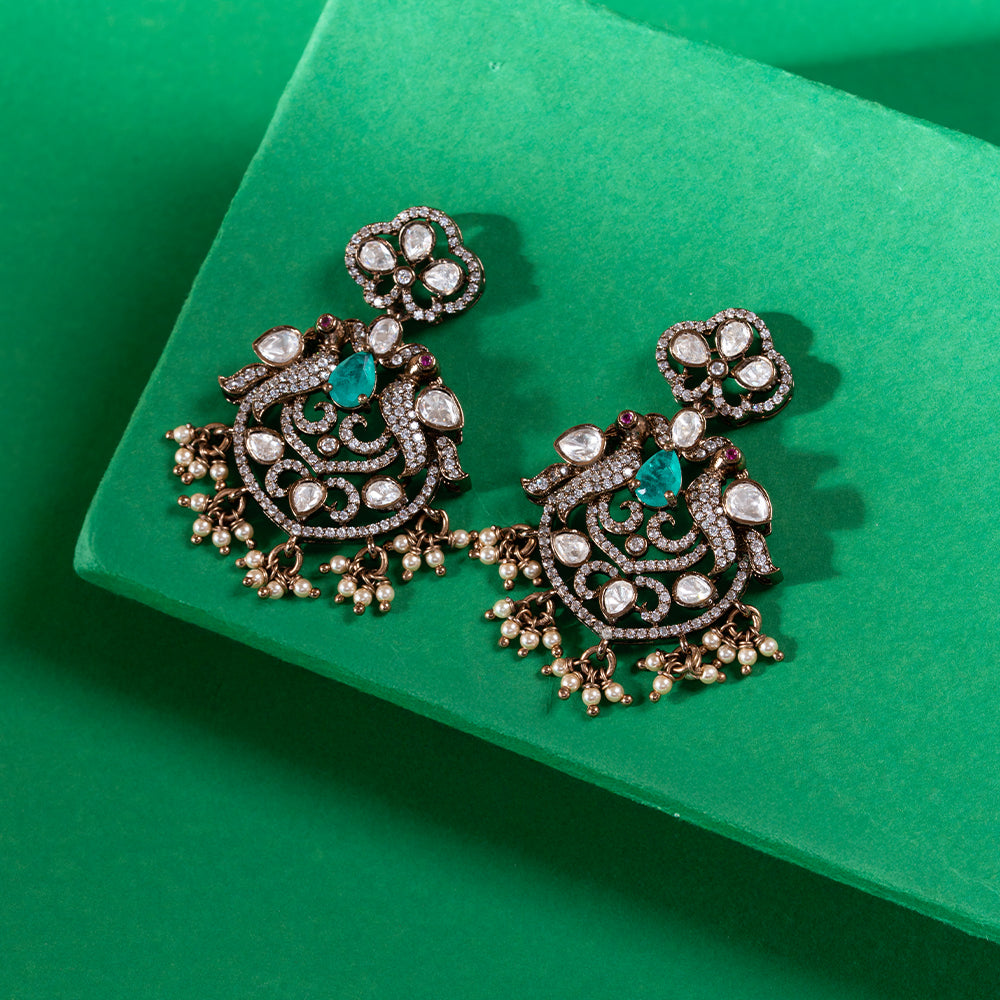 The Tropical Muse Necklace Set showcases exquisite craftsmanship featuring Parrot, Pear, and Floral motifs. At its heart lies a stunning emerald centre stone, complemented by sparkling Moissanite and Cubic Zirconia accents. Delicately suspended hangings of carved Amethyst, Coral, and Pearls add depth and elegance, creating a harmonious blend of colour and texture. This set is a refined choice for those seeking a statement piece that combines nature-inspired artistry with luxurious gemstone.