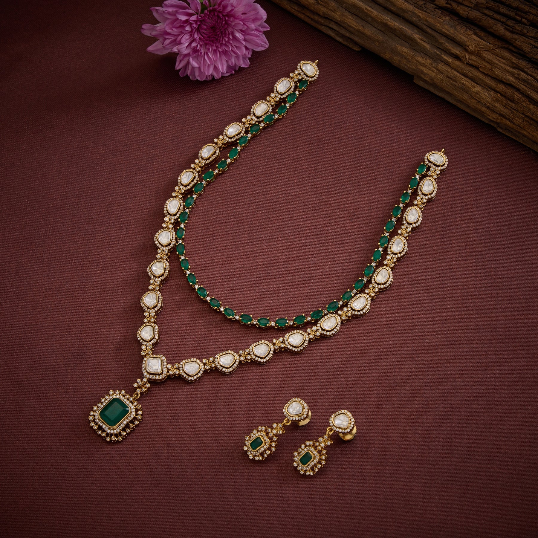 The Twiora Necklace Set features a sophisticated Rectangular design with dual-layer construction, combining the timeless elegance of Emeralds with the brilliant sparkle of Moissanite and Cubic Zirconia stones. This expertly crafted piece balances luxury and versatility, offering the visual impact of fine gemstones. The layered architecture creates dimensional depth, while the carefully selected stone combination ensures lasting radiance and durability. Perfect for those who appreciate refined craftsmanship and distinctive design.