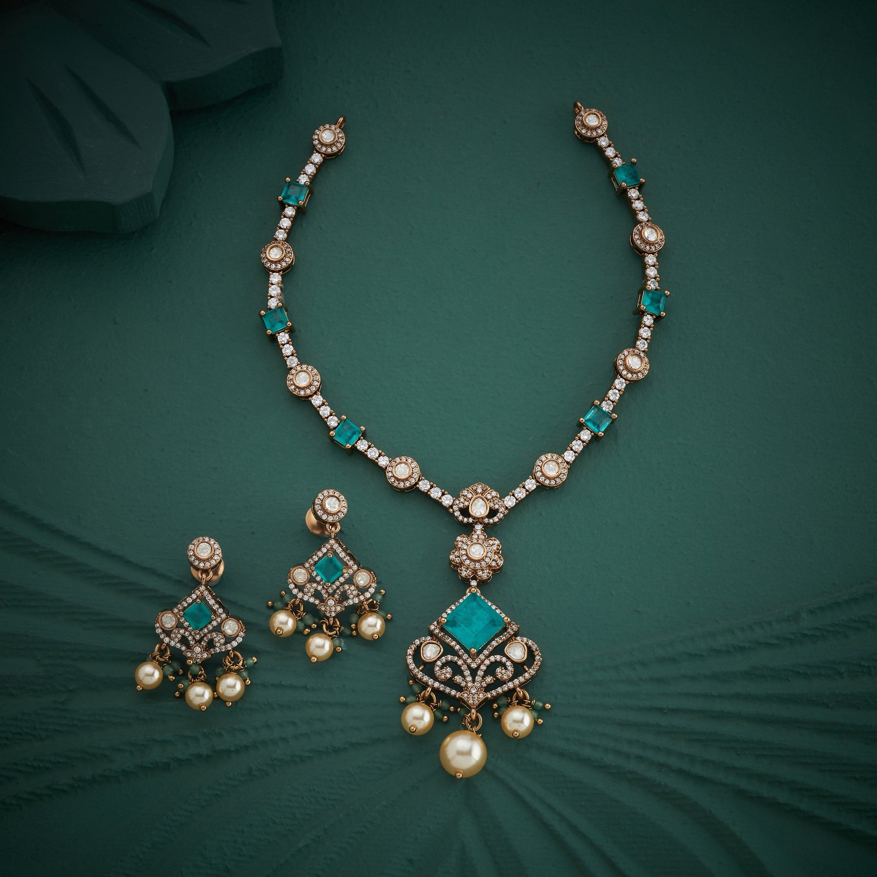 The Vintage Victorian Necklace Set exemplifies refined artistry with its distinctive Floral design and square-cut Emerald focal point. Adorned with shimmering Moissanites and Cubic Zirconia stones, the piece gains dimensional sparkle and contemporary allure. Delicate Pearl and Emerald hangings cascade gracefully, adding movement and vintage-inspired sophistication. This expertly crafted set merges classical aesthetics with modern gemstone brilliance, making it an ideal choice for discerning jewellery enthusiasts seeking a statement piece with enduring elegance and intricate detailing.