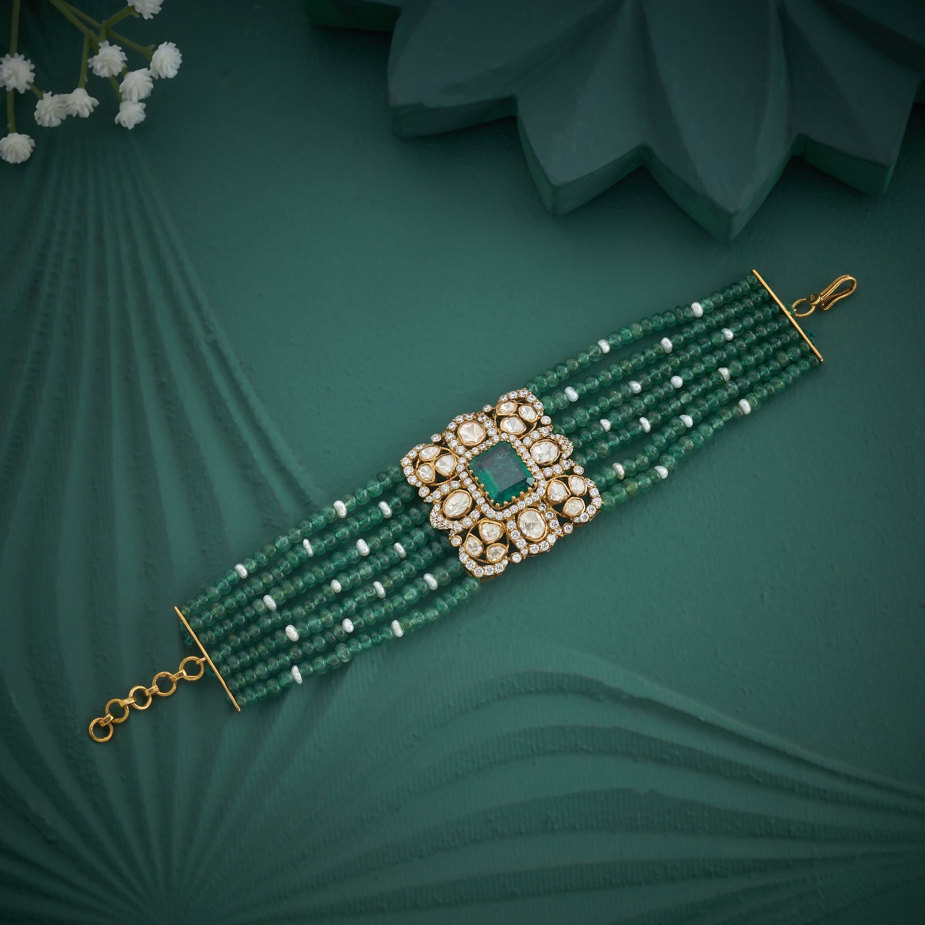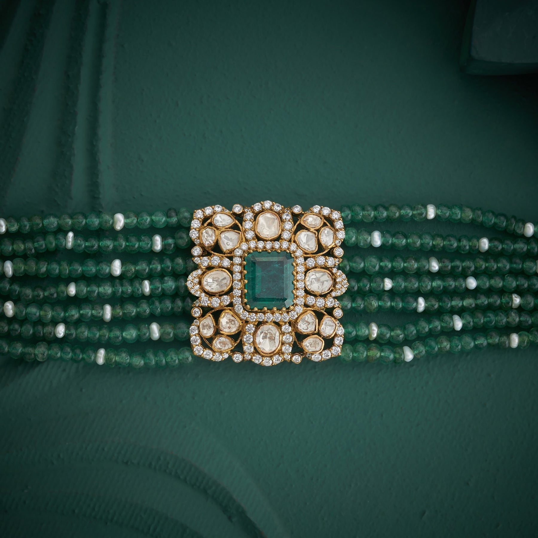 Victorian Elara Choker Crafted with meticulous attention to period detail, this Victorian-inspired choker combines lustrous Moissanites and Cubic Zirconia stones with verdant Green beads for a sophisticated aesthetic. The Green stone accents add depth and vintage charm, while the precision-cut Moissanites deliver exceptional brilliance. Ideal for those seeking timeless elegance with a contemporary sparkle, this piece captures the ornate sensibility of Victorian design while maintaining wearable comfort and lasting durability.