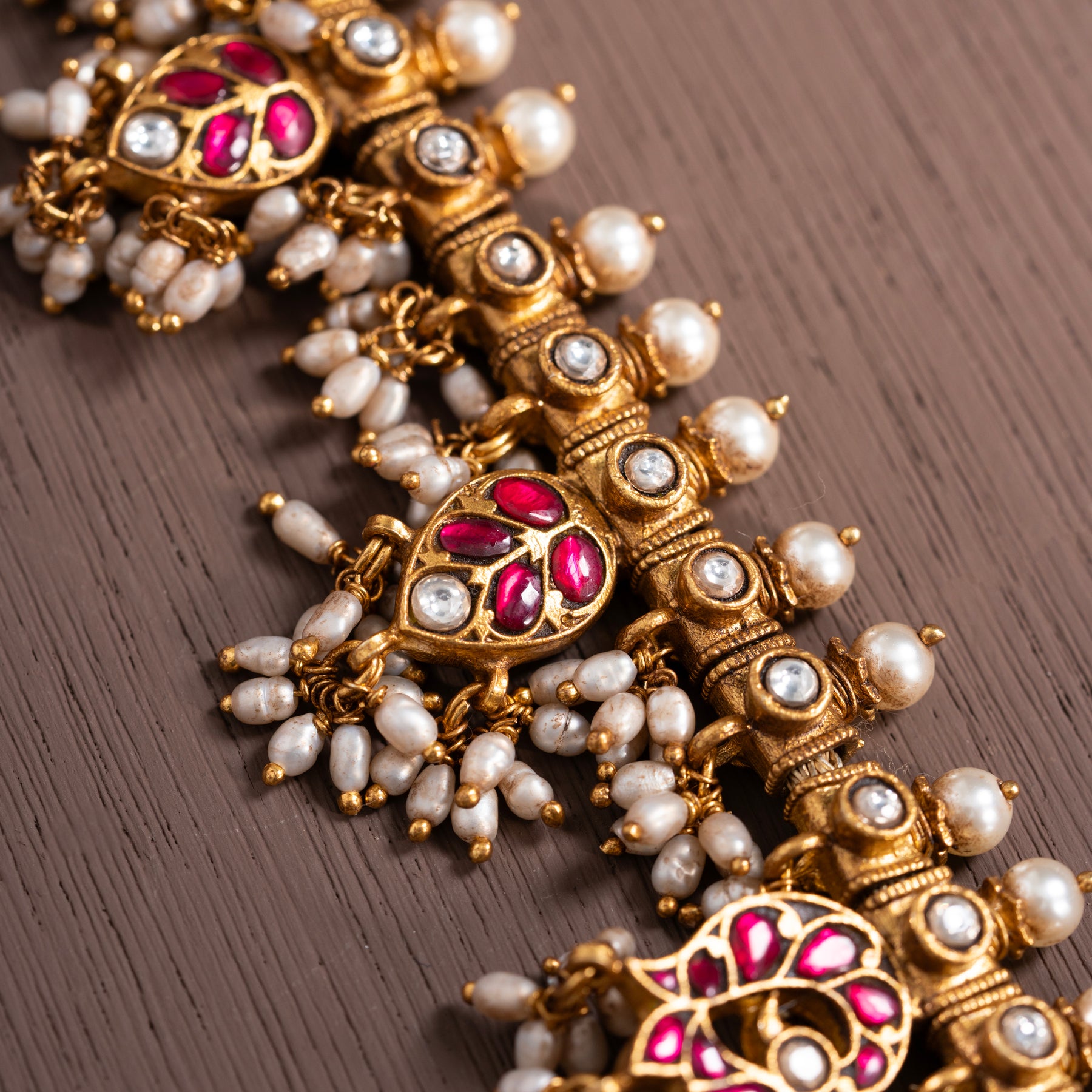 The Amrit Kusum Pasalu Haaram showcases exquisite Floral designs intricately crafted with Kundan Settings. Accentuated by vibrant Rubies and Emeralds, this piece exudes timeless elegance. Delicate Pearl Hangings add a graceful movement, enhancing its traditional charm and making it an expert choice for sophisticated occasions.