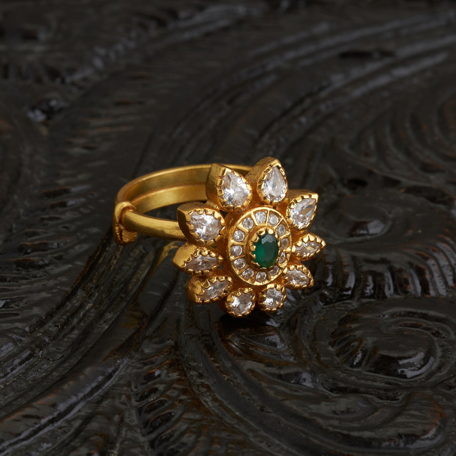 The Arundhati Ring showcases expertly crafted design featuring sparkling Cubic Zirconia stones paired with vibrant Emeralds. This combination delivers an elegant contrast, enhancing the ring’s brilliance and colour depth. Perfect for those seeking refined sophistication, it adds a timeless touch to any collection while offering the rich allure of emeralds alongside the clarity of CZ stones.