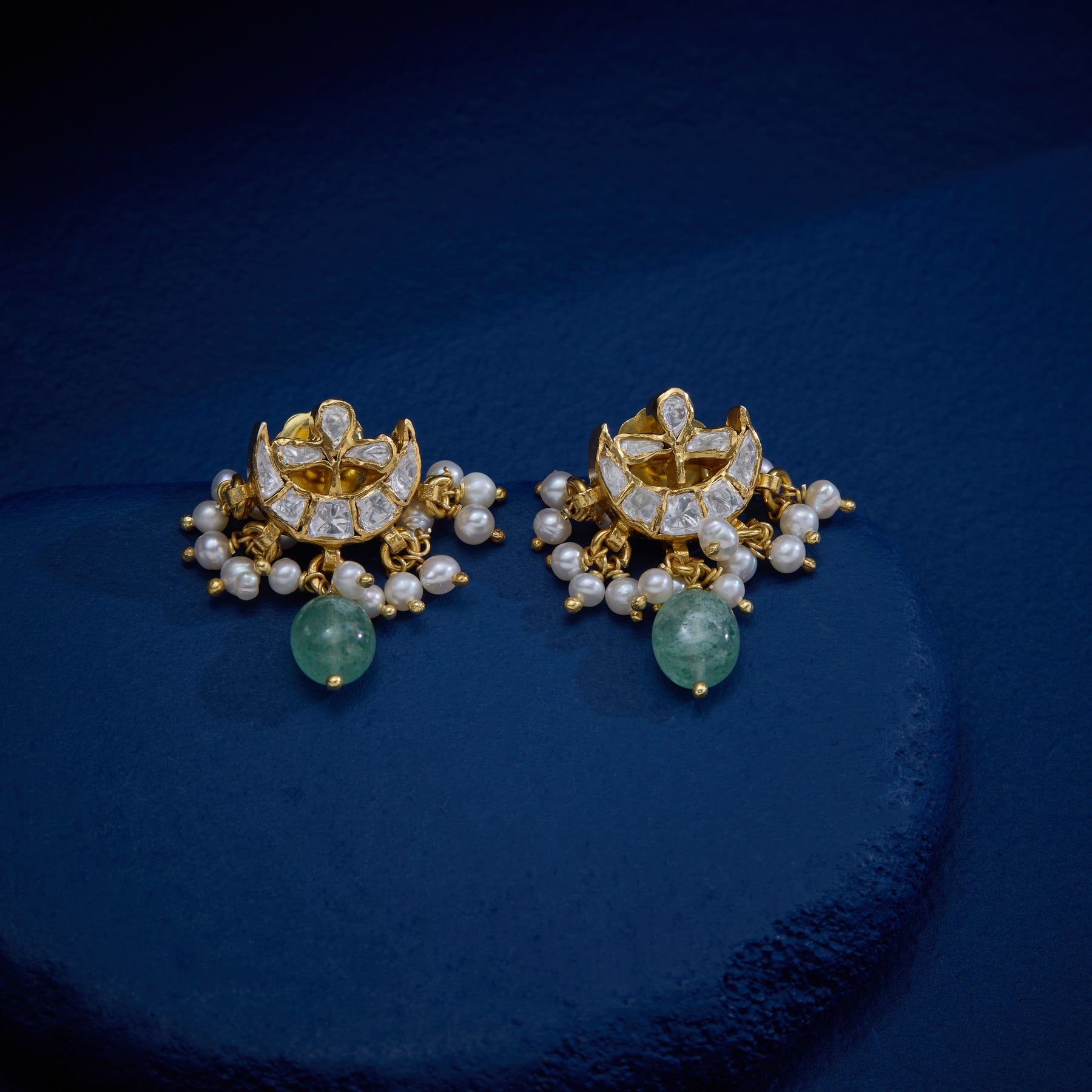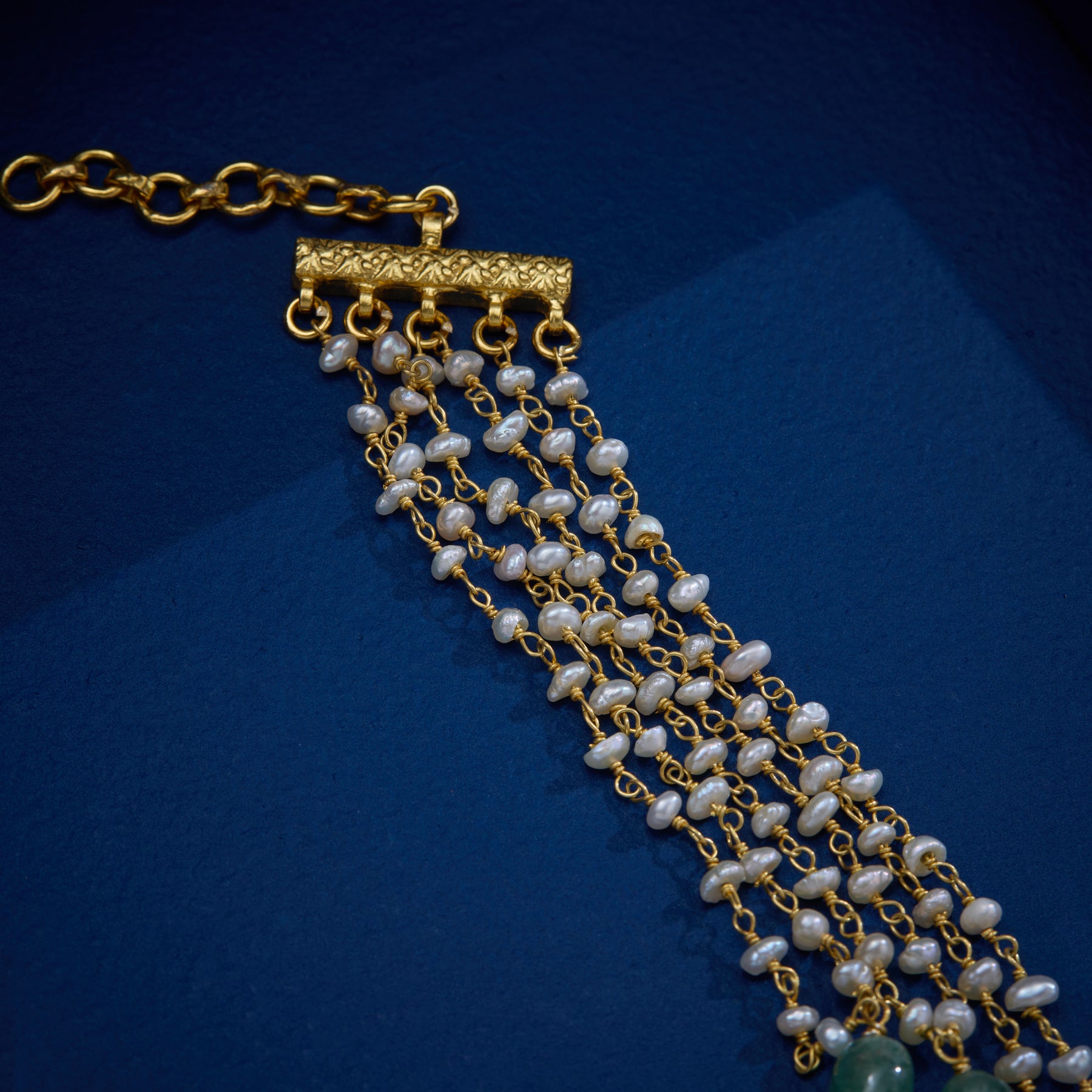The Aurelia Strings Choker Set showcases expert craftsmanship with a delicate Floral design, enhanced by sparkling Moissanite stones. Pearl beads add a touch of classic elegance, while Emerald Drops bring vibrant color and sophistication. This set balances timeless beauty with refined detail, making it an exquisite choice for special occasions.