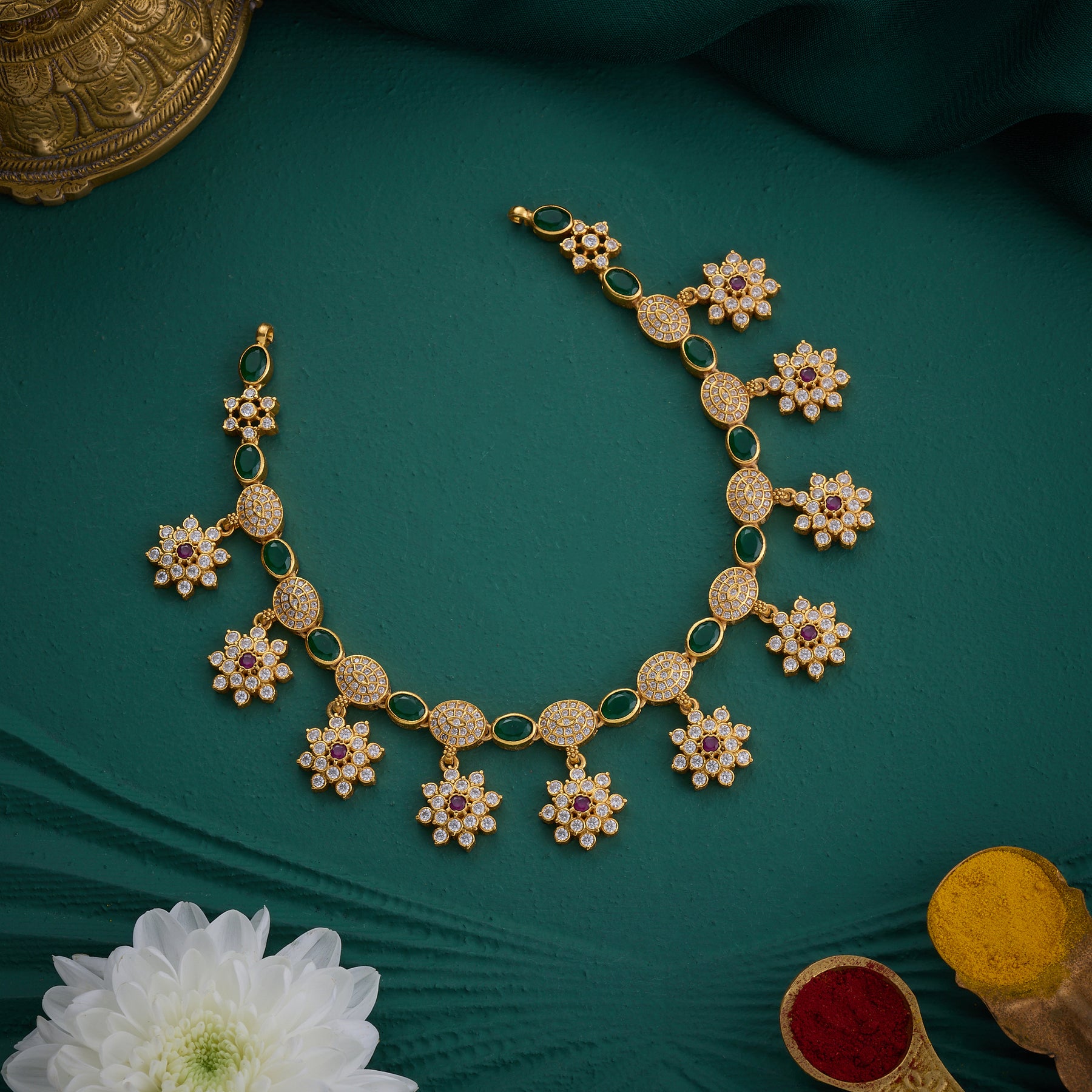 The Avaran Pushpavali Short Necklace showcases exquisite Floral motifs intricately adorned with sparkling CZ stones, vibrant Emeralds, and rich Rubies. This design blends traditional artistry with refined elegance, making it a perfect statement piece to enhance any outfit with a touch of sophisticated beauty.