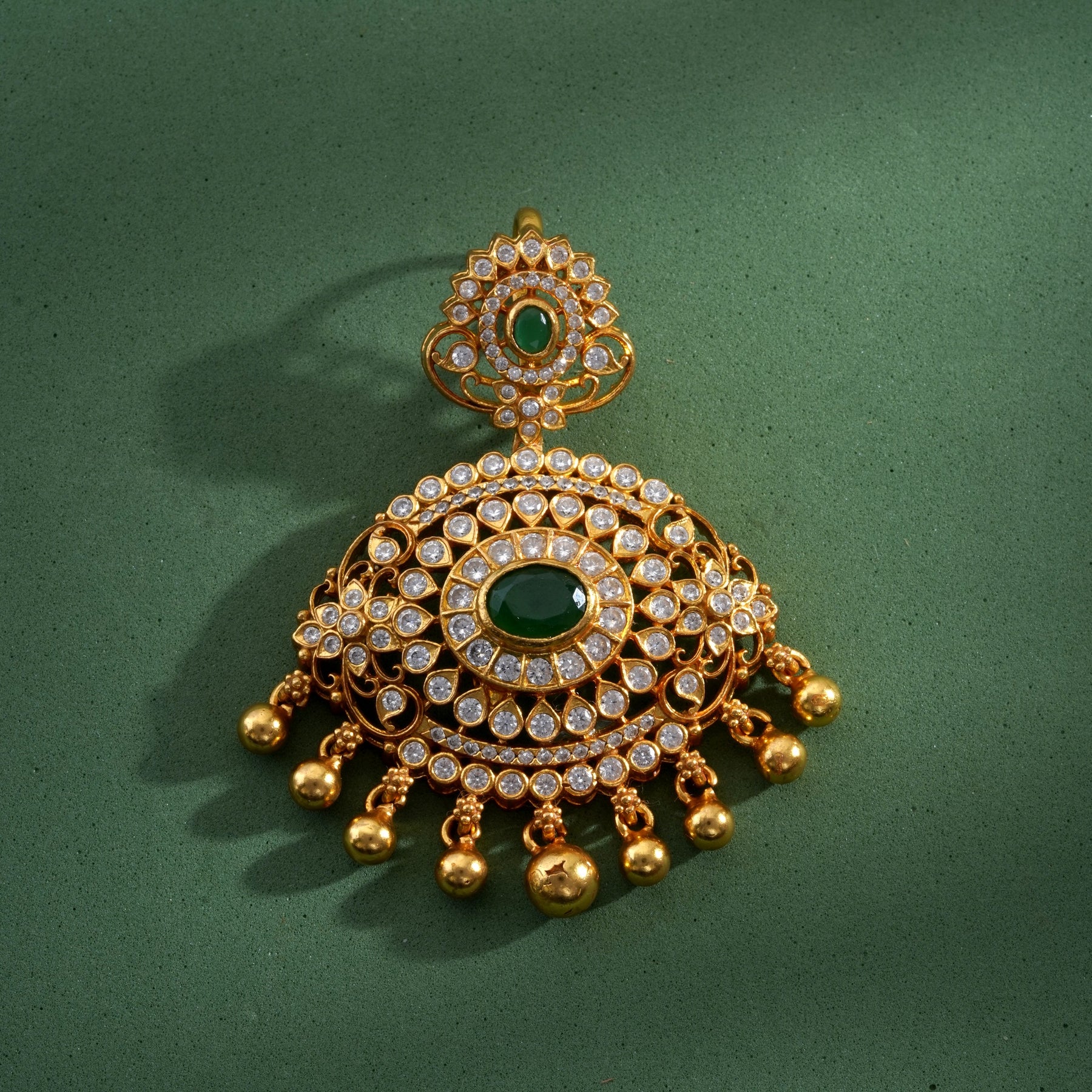 The Avaran Virelle Pendant showcases intricate Floral detailing adorned with sparkling Cubic Zirconia stones and rich Emerald accents. Golden Beads cascade gracefully from the design, creating an elegant hanging element that catches light beautifully. This sophisticated piece combines traditional craftsmanship with refined aesthetics, making it an ideal choice for those seeking distinctive jewellery with layered visual interest and timeless appeal.