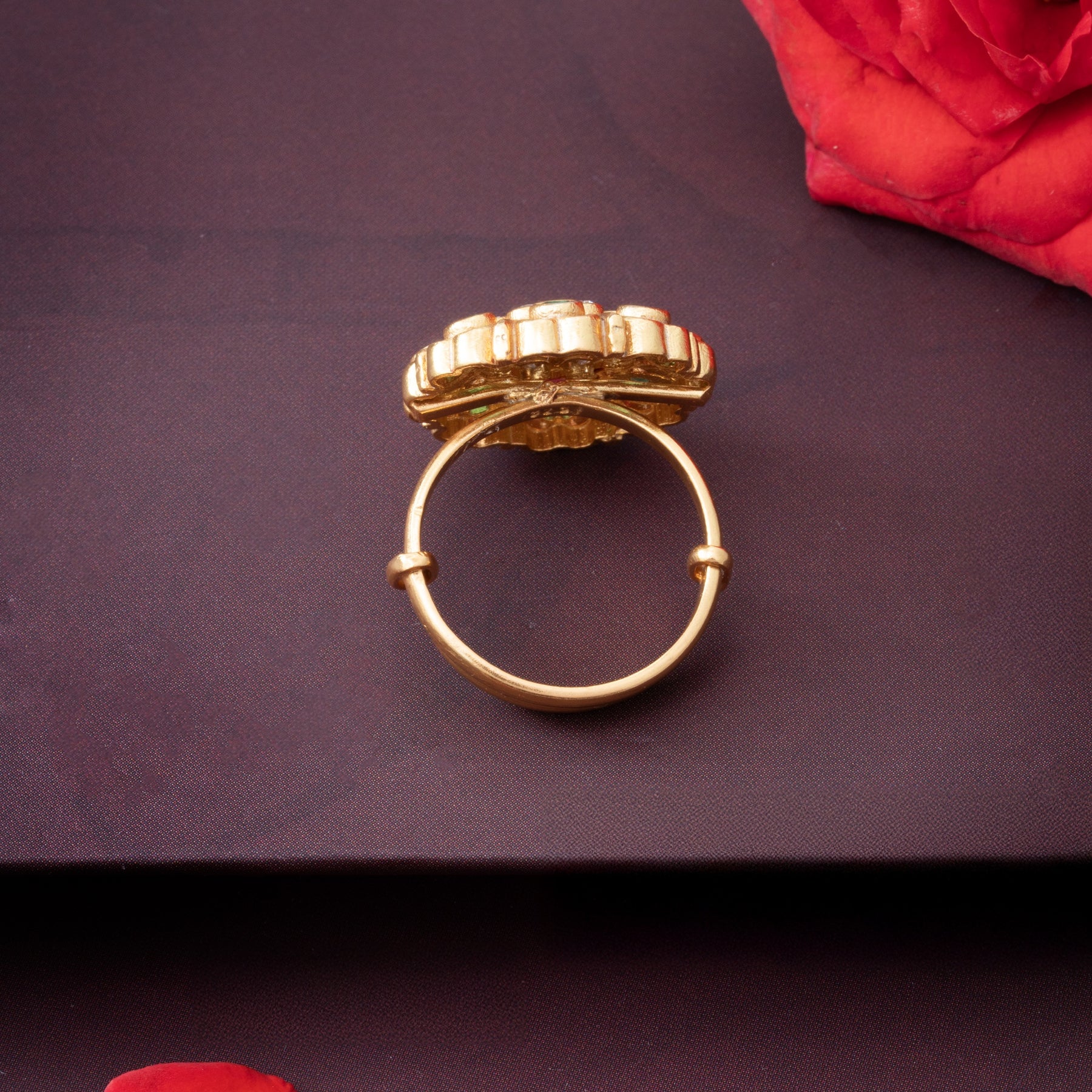 Blumira Ring Adjustable showcases exquisite craftsmanship with a striking ruby centrepiece surrounded by vibrant Emeralds and sparkling Cubic Zirconia stones. The Floral design creates an elegant botanical aesthetic, blending traditional artistry with contemporary sophistication. Each stone is carefully selected and set to maximize brilliance and colour depth. Perfect for those who appreciate intricate jewellery that makes a refined statement, this ring combines timeless elegance with distinctive character.