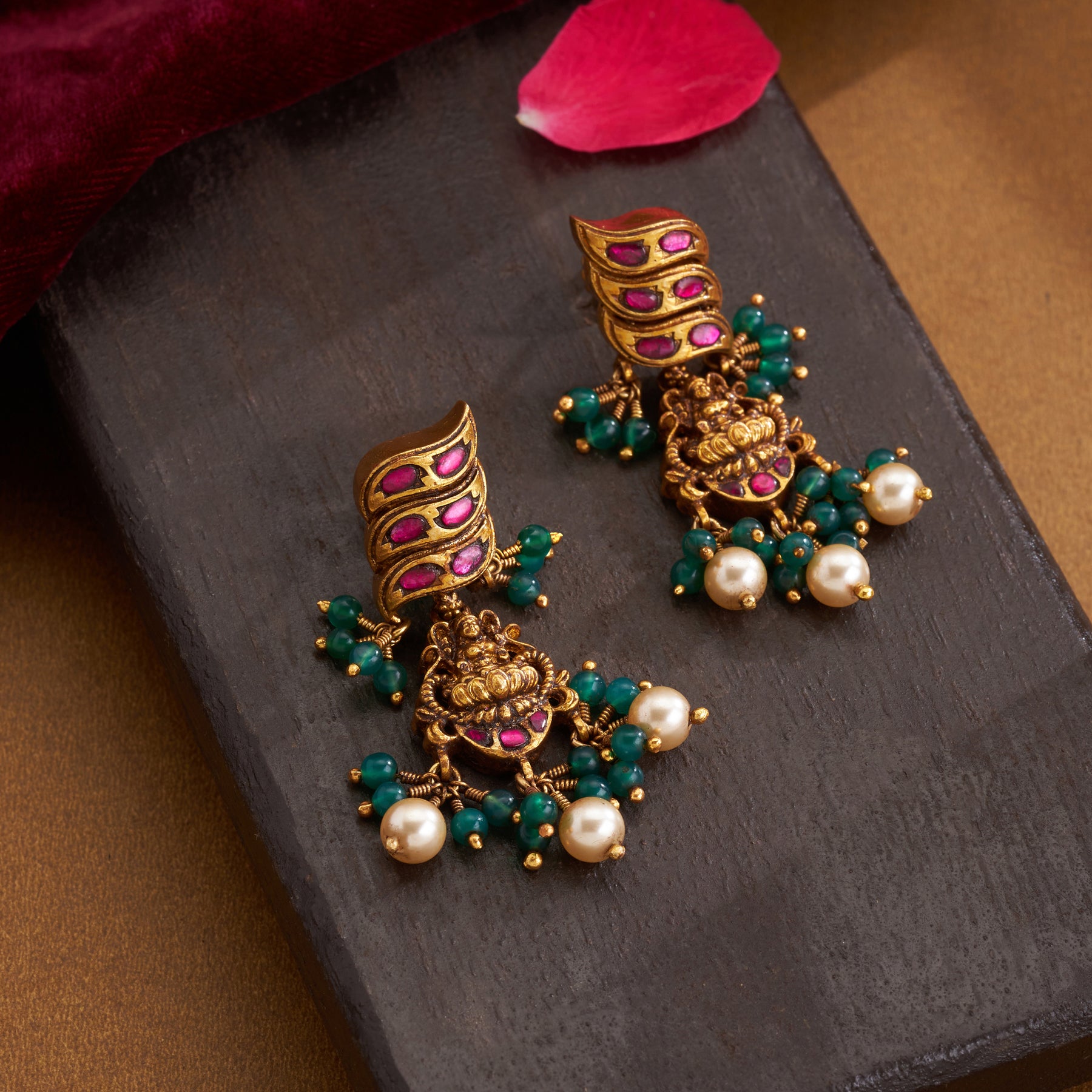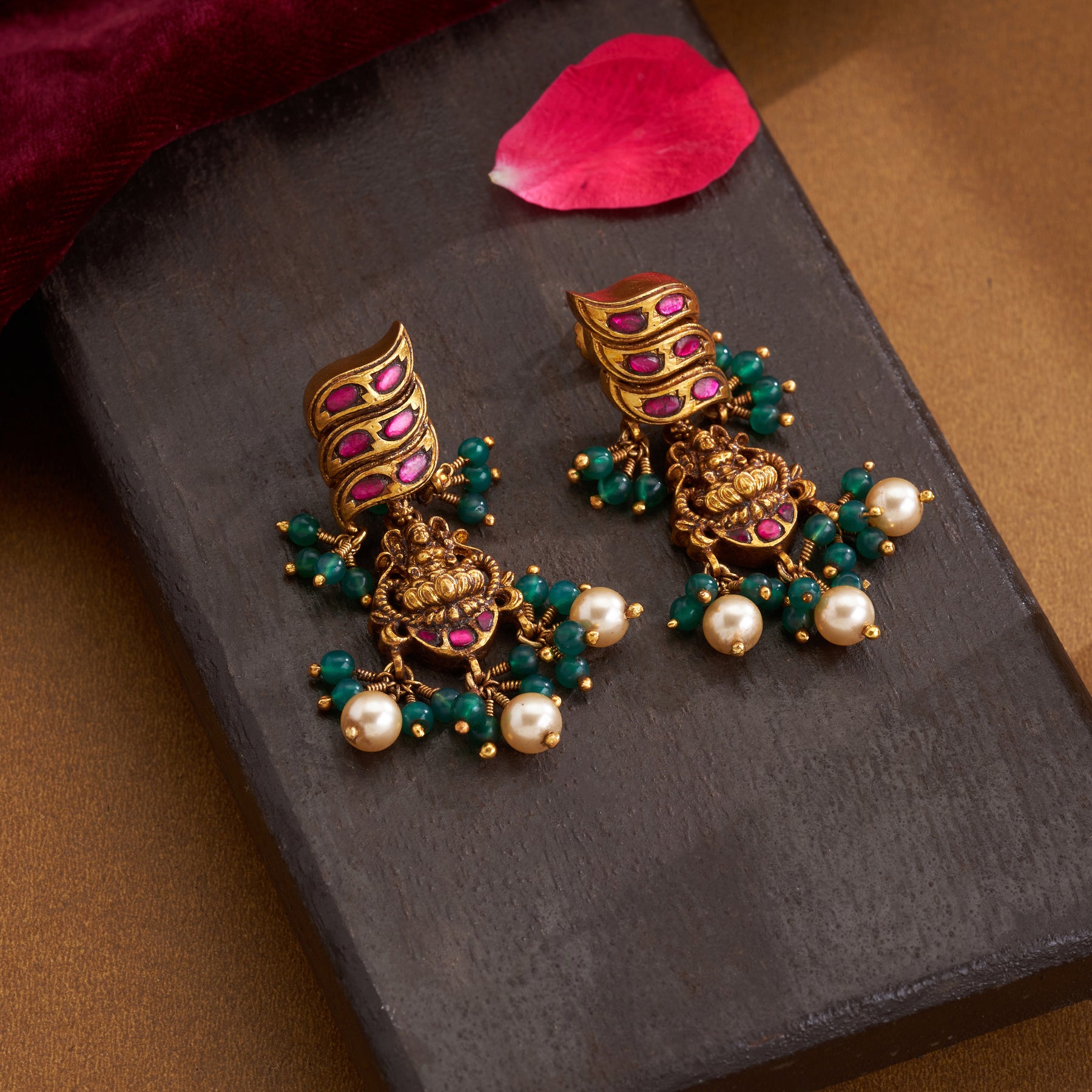The Kamala Priya Danglers feature an exquisite Lakshmi design, meticulously crafted with Kundan-set rubies that add vibrant brilliance. Enhanced by delicate pearl and intricately carved coral hangings, these danglers combine traditional artistry with sophisticated elegance, making them a distinguished choice for refined occasions.