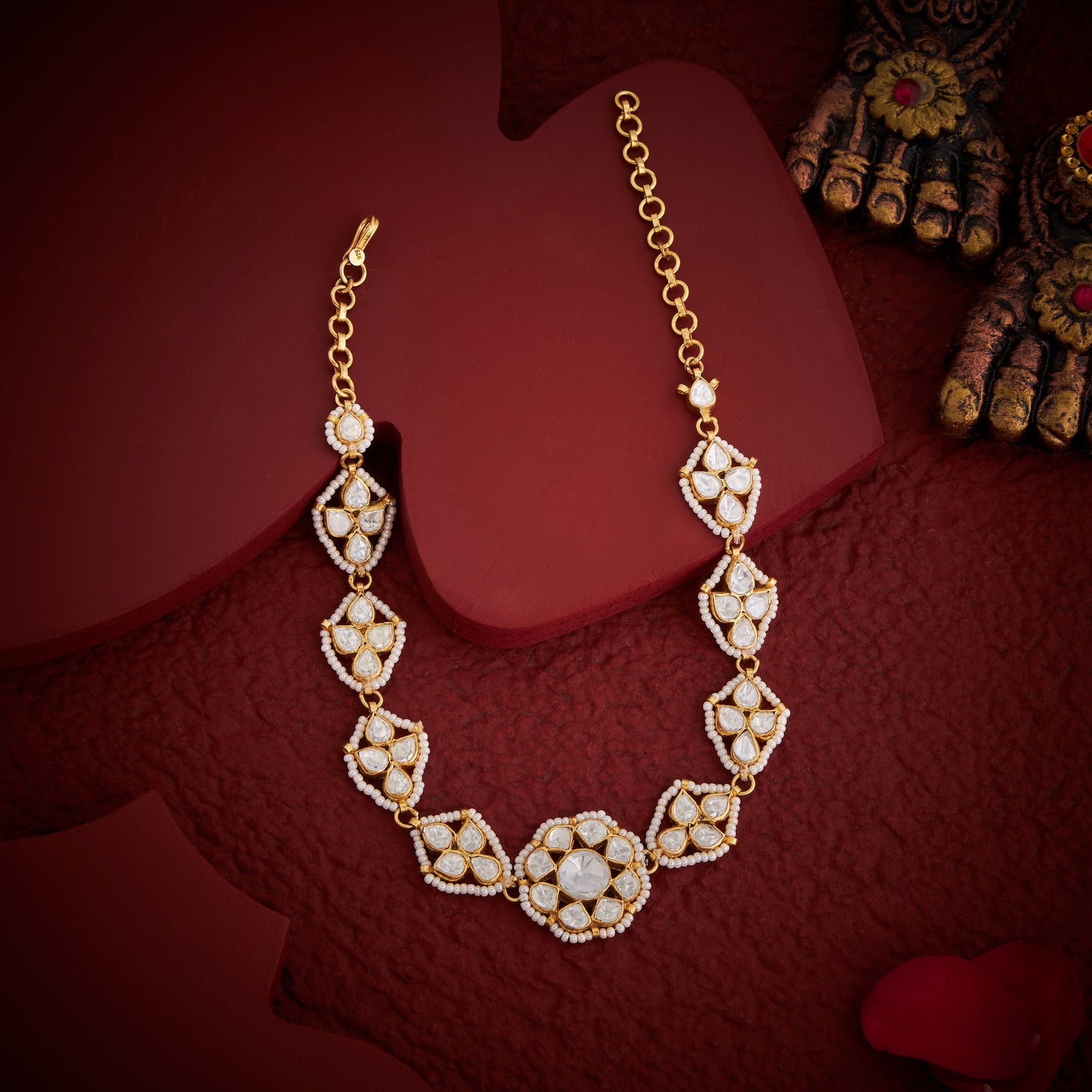 The Dewy Petal Necklace elegantly combines delicate Floral motifs with the brilliance of Moissanite and the Luster of Pearls. Expertly crafted, this piece highlights the natural beauty of each element, offering a refined accessory that enhances any ensemble with subtle sophistication and timeless charm. Perfect for those who appreciate intricate design and enduring quality in their jewellery collection.