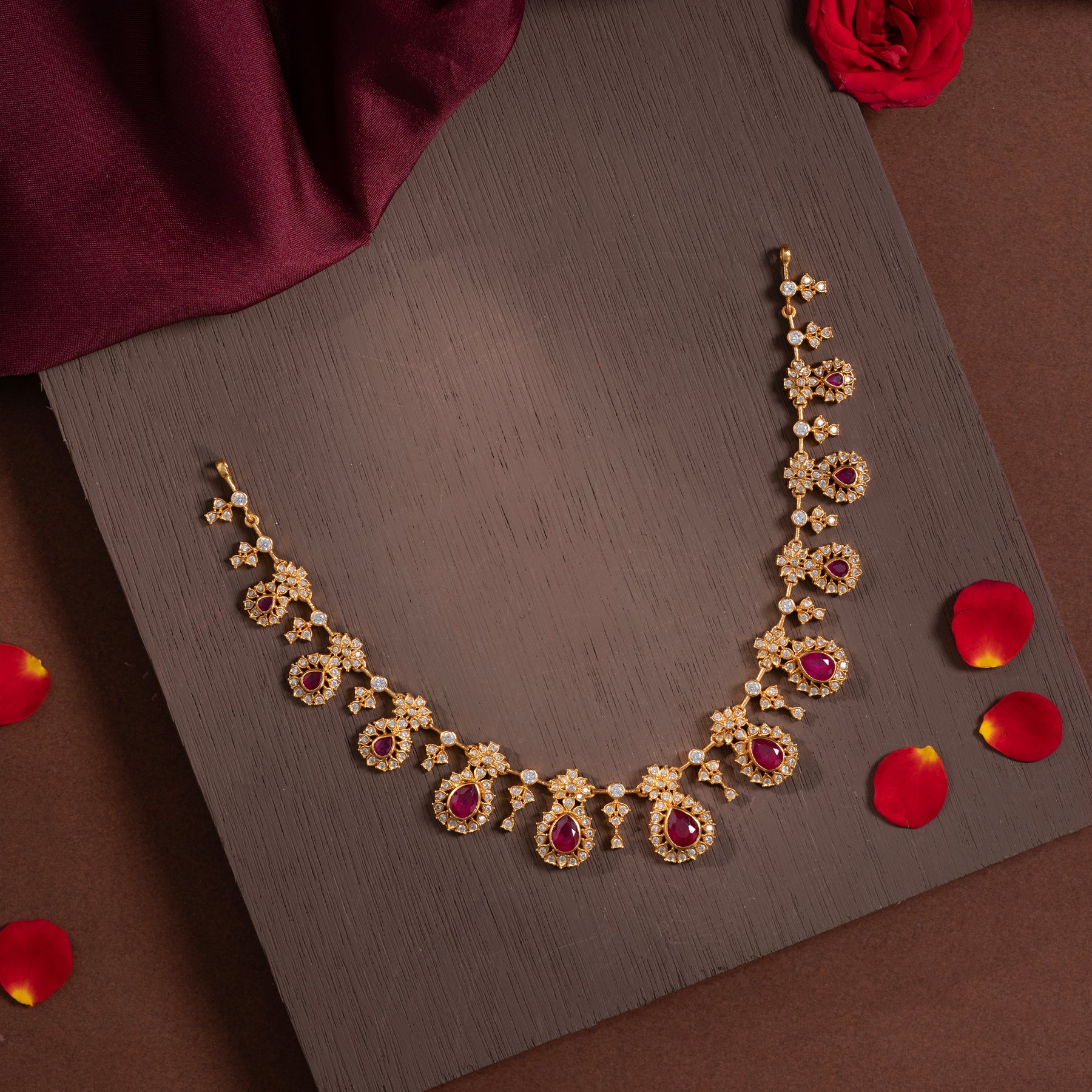 The Divya Manikya Short Necklace features an expert design combining delicate Floral Motifs with sparkling Cubic Zirconia stones and vibrant Rubies. This exquisite piece offers a refined elegance, perfect for enhancing any ensemble with a touch of sophisticated charm. Crafted to highlight the contrast between brilliant CZ stones and rich Rubies, it beautifully captures the essence of traditional artistry with a contemporary appeal.