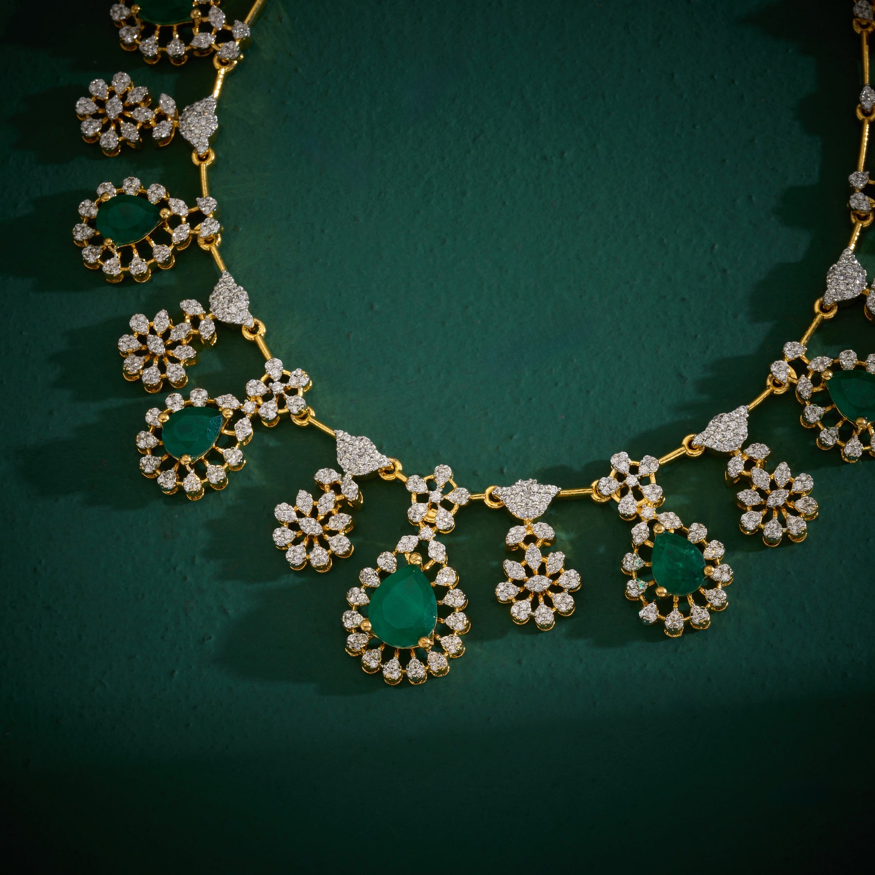 The Emerald Elencia Necklace Set combines sophisticated design with semi precious gemstone craftsmanship. This exquisite piece features lustrous Emeralds paired with sparkling Cubic Zirconia stones, creating a striking contrast of deep Green and brilliant sparkle. The Pear-shaped elements and delicate Floral motifs add an elegant, nature-inspired dimension to the design. Perfect for special occasions, this necklace set showcases refined artistry and timeless appeal.