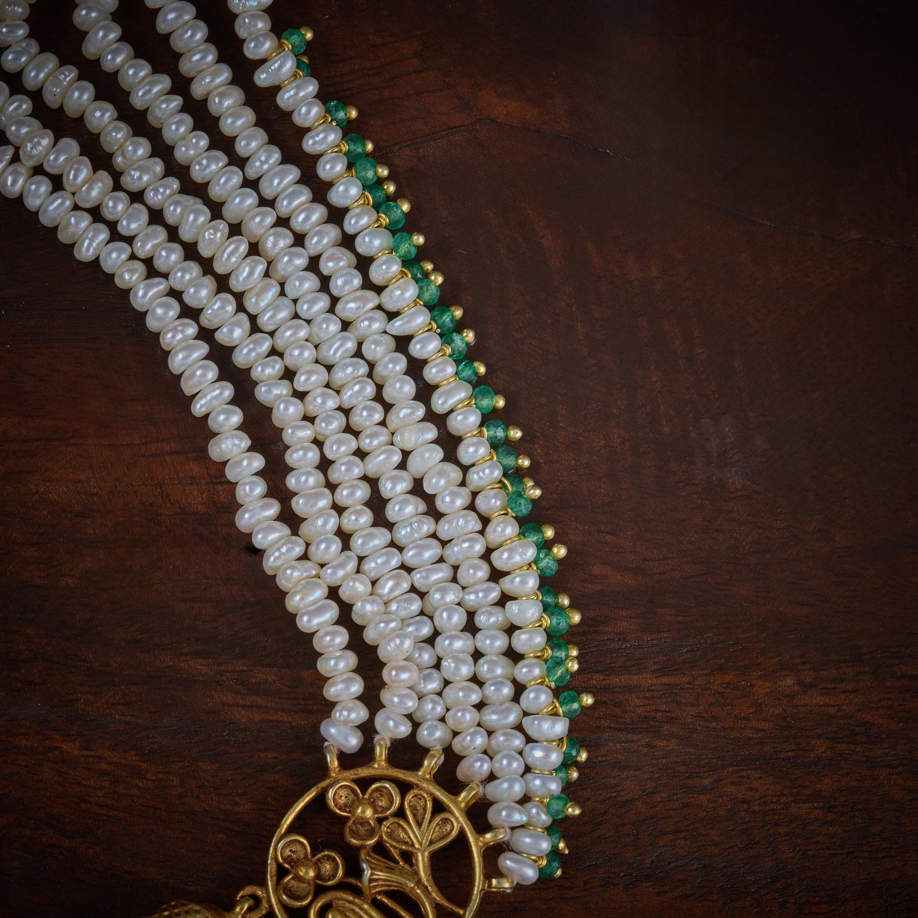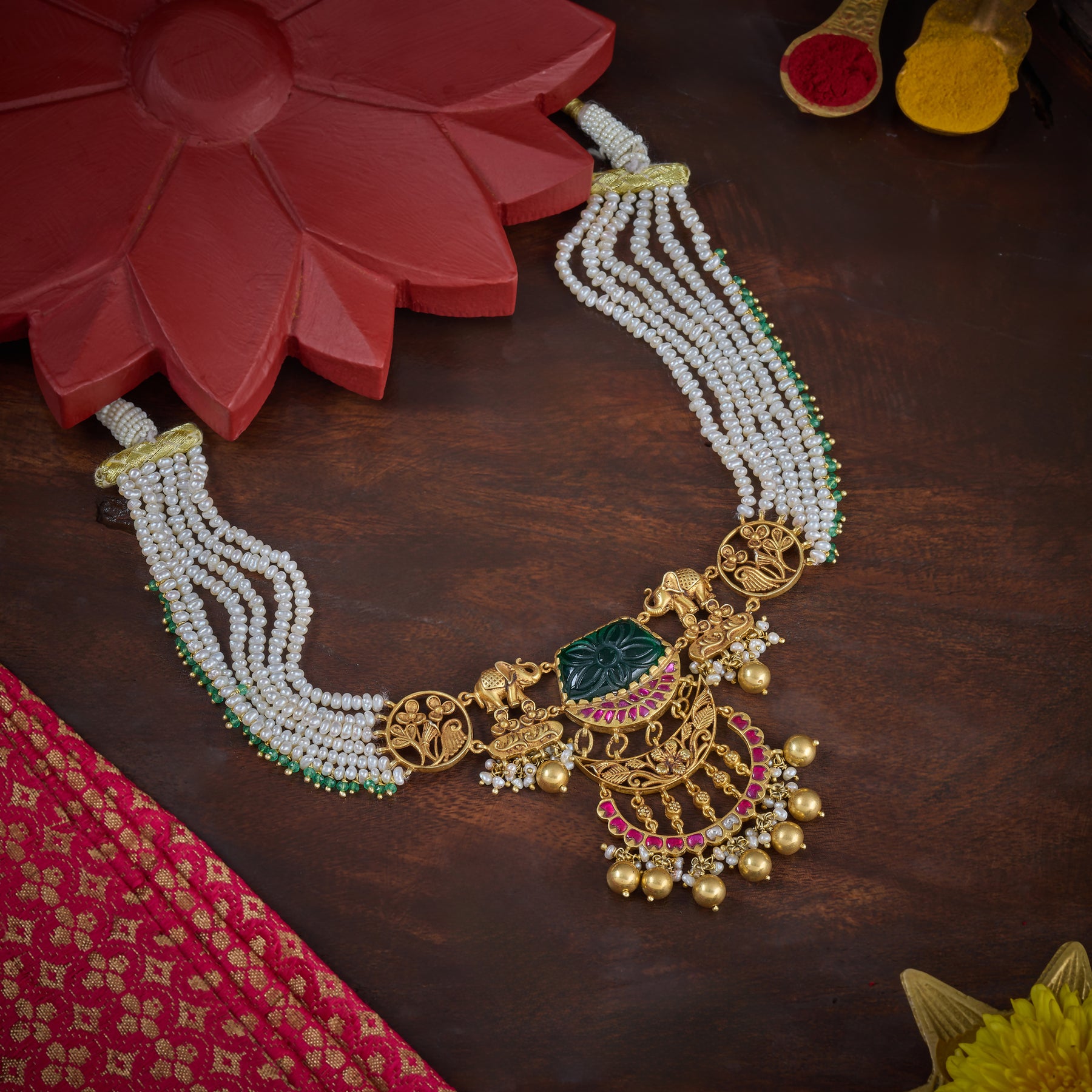 The Emergaja Choker showcases intricate Elephant and Floral Motifs, highlighting exquisite craftsmanship. At its center, a beautifully Carved Emerald stone is set with traditional Kundan work, adding a regal touch. Delicate Golden Bead Hangings enhance its elegance, making this piece a refined statement of heritage and artistry.
