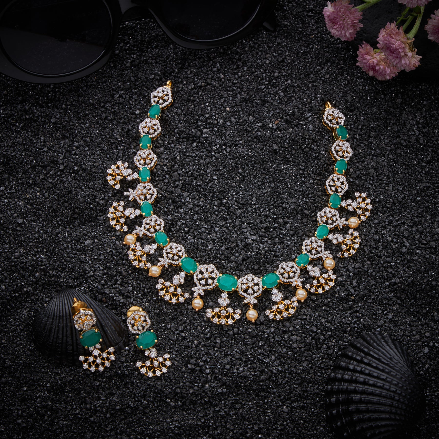This expertly crafted Floral & Luster Necklace features an elegant combination of floral and oval designs, adorned with sparkling Cubic Zirconia stones and vibrant Emeralds. Delicate Pearl hangings add a graceful touch, enhancing its timeless appeal. Perfect for elevating any ensemble with refined sophistication.