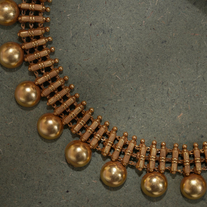 This Gajra Necklace showcases an expert blend of traditional floral motifs and delicate gajra design, enhanced with shimmering golden beads. Its intricate craftsmanship highlights cultural elegance, making it a refined accessory for special occasions. The combination of floral elements and golden accents adds a timeless charm, perfect for complementing ethnic attire with sophistication.