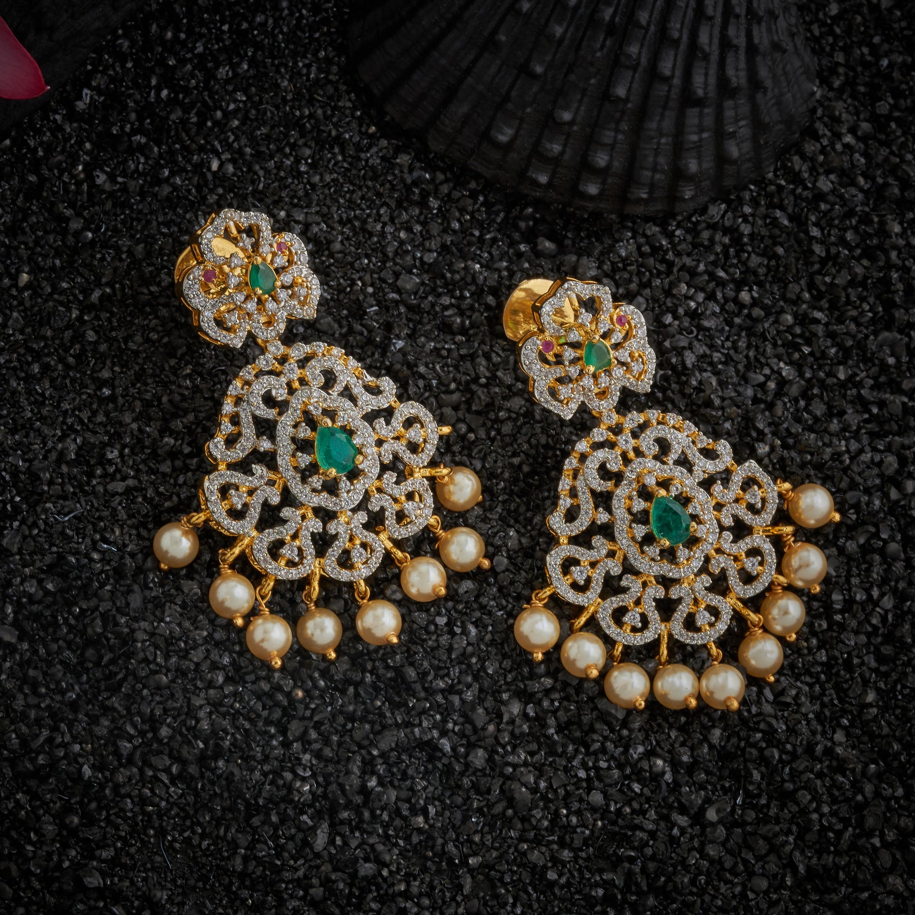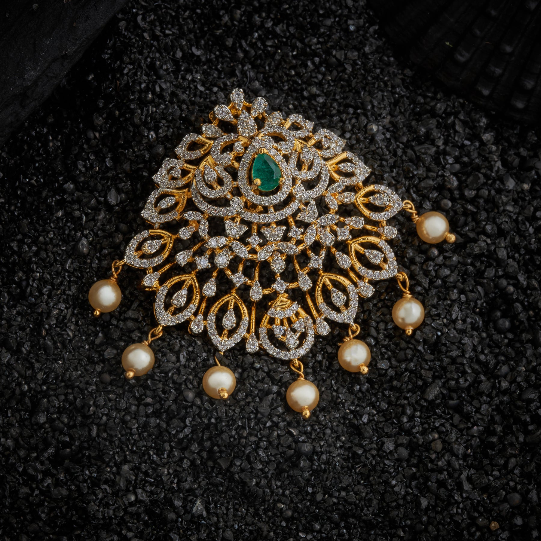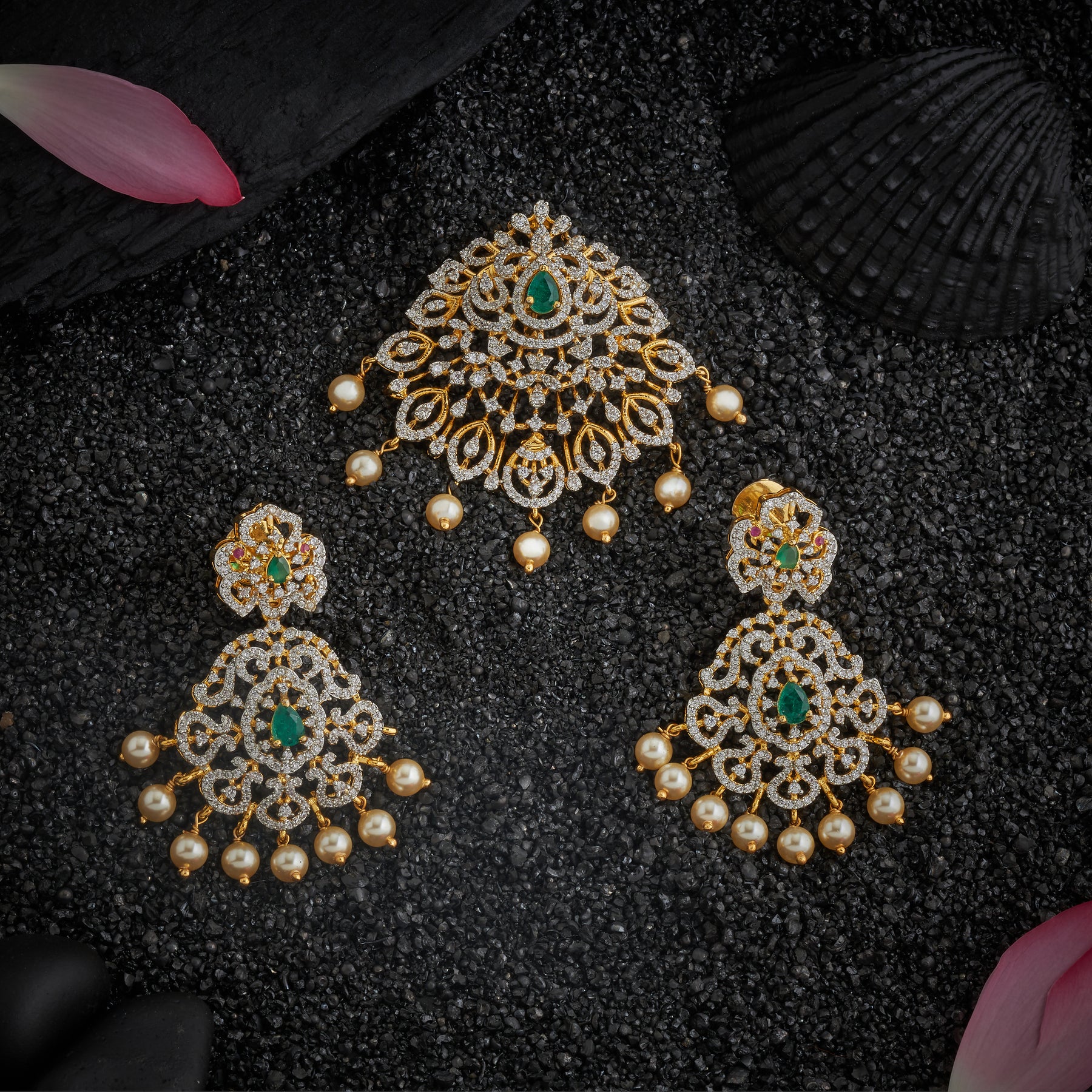 Glitzpear Pendant Set showcases refined craftsmanship with a stunning Pear-shaped centrepiece complemented by sparkling Cubic Zirconia stones. The design features rich emerald accents that add depth and sophistication, while delicate Pearl hangings create graceful movement and elegance. This versatile pendant set combines contemporary styling with timeless appeal, making it an ideal choice for special occasions. The interplay of gemstones and Pearls delivers a luxurious aesthetic that elevates any ensemble.