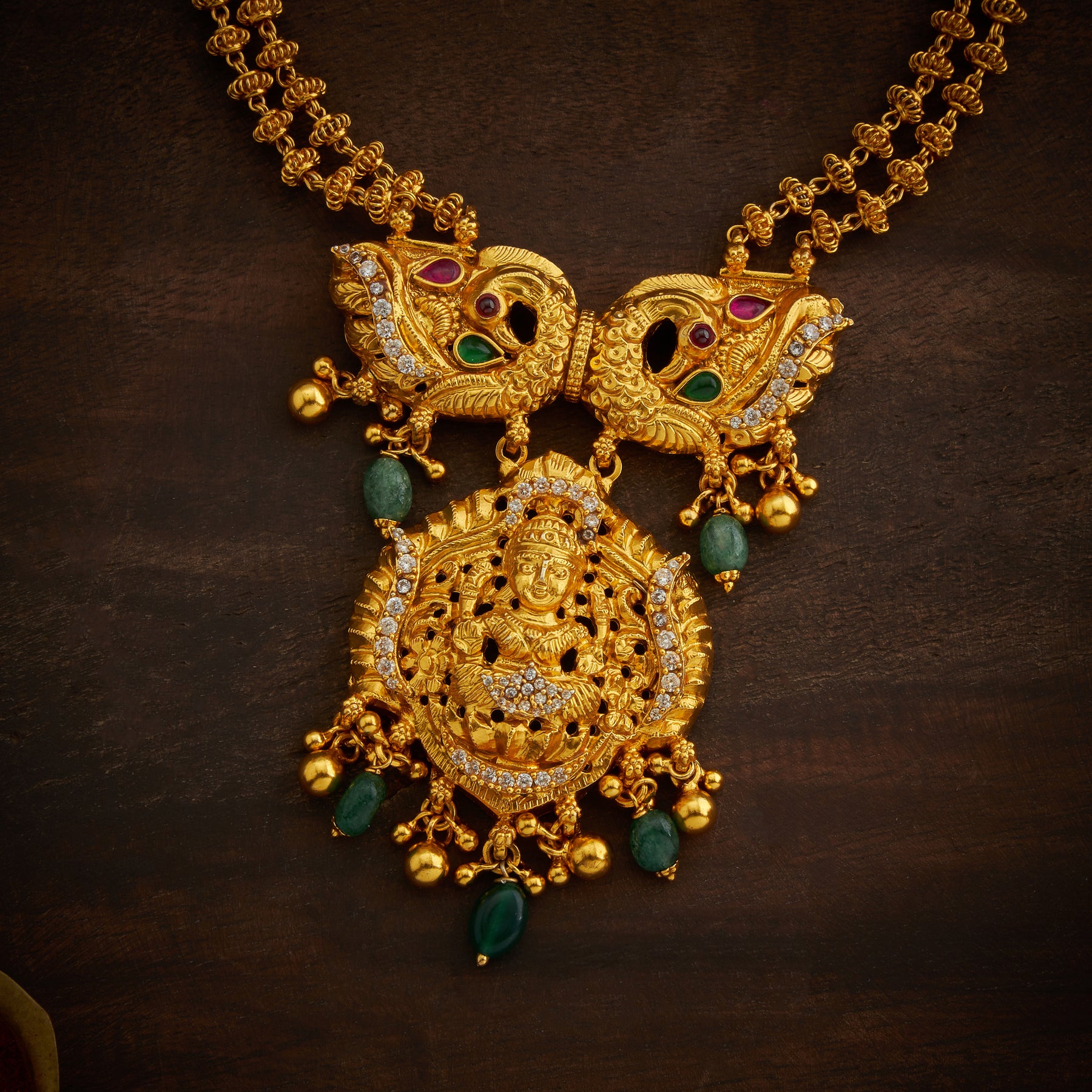 The Komalavati Haaram showcases intricate craftsmanship inspired by Lakshmi motifs and elegant Peacock designs. Adorned with sparkling Kundan and CZ stones, complemented by rich Emeralds and Golden beads, this necklace beautifully merges traditional artistry with luxurious details, perfect for elevating any special occasion ensemble.