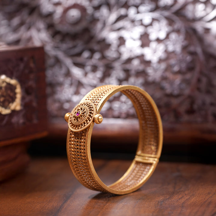 The Kalika Antique Kada is expertly crafted featuring a distinctive Chakra-shaped design adorned with intricate Floral. A vibrant Ruby centerpiece enhances its traditional elegance, making it a refined accessory that blends cultural symbolism with timeless beauty. Ideal for those who appreciate detailed craftsmanship and meaningful jewellery.