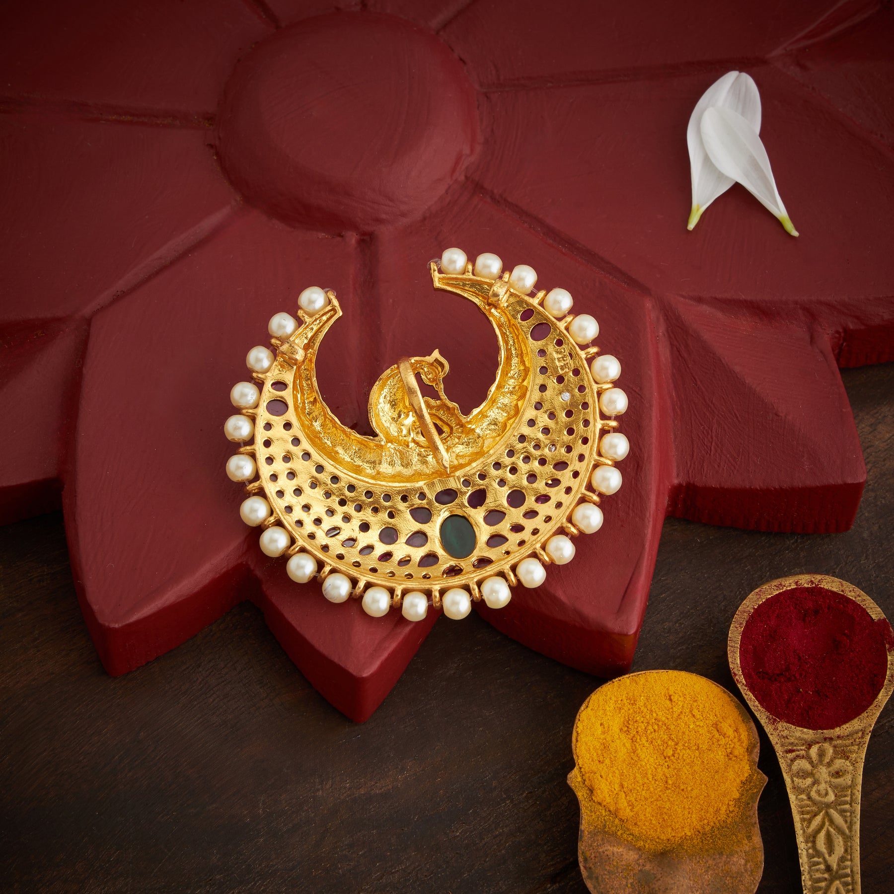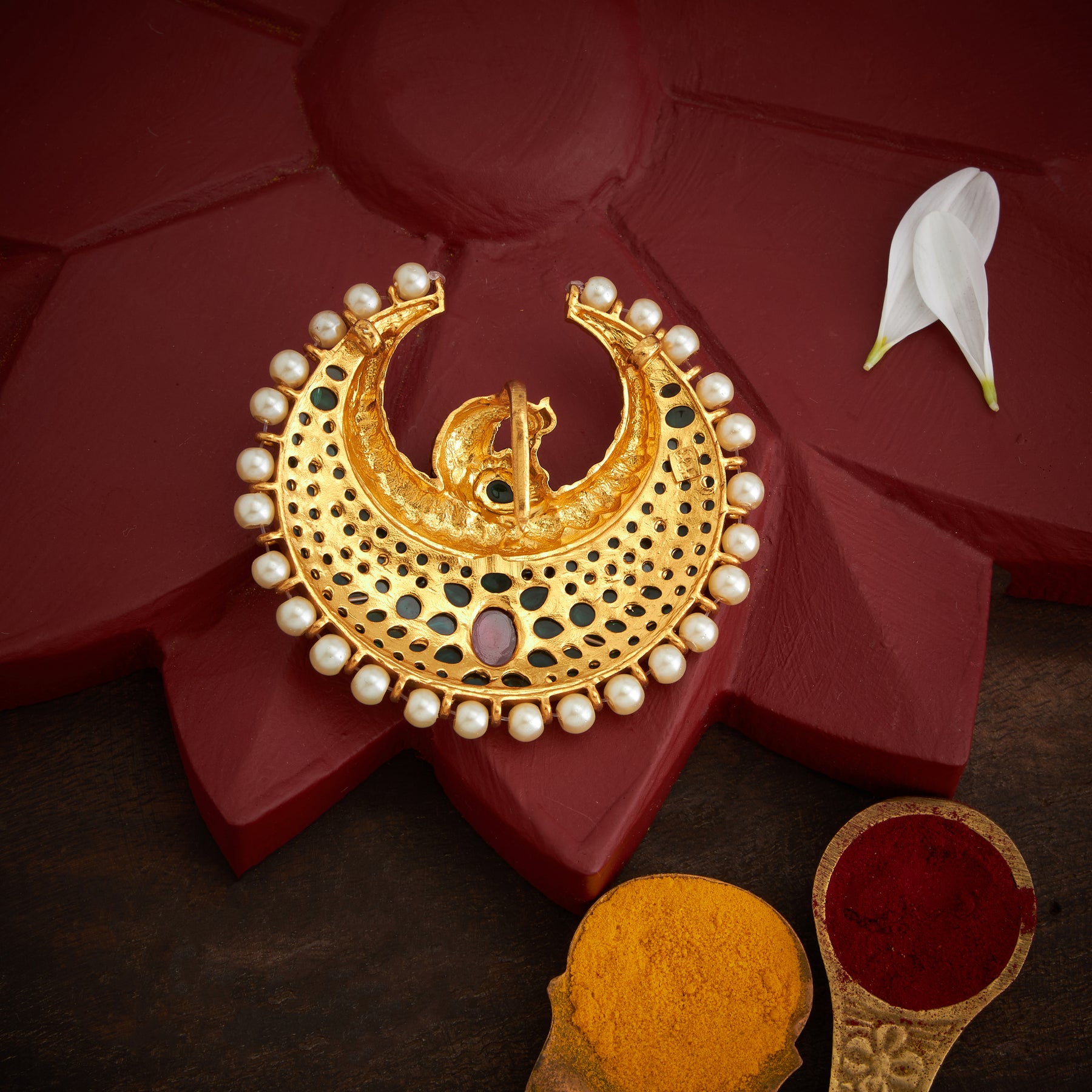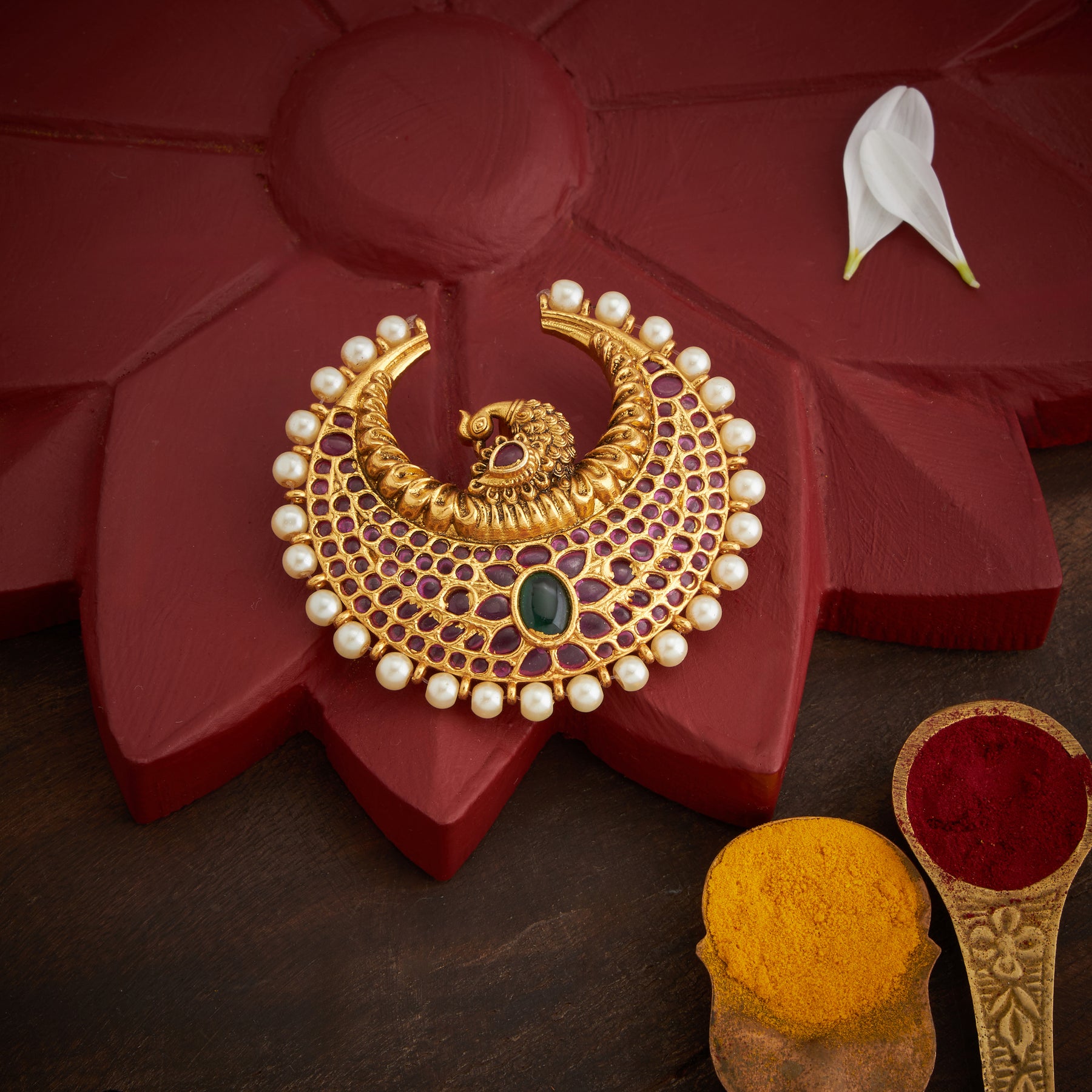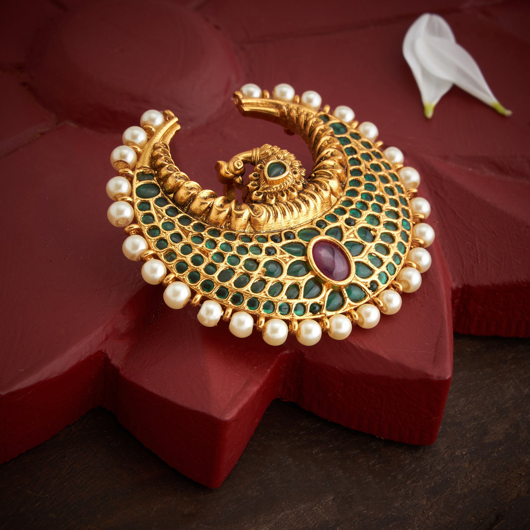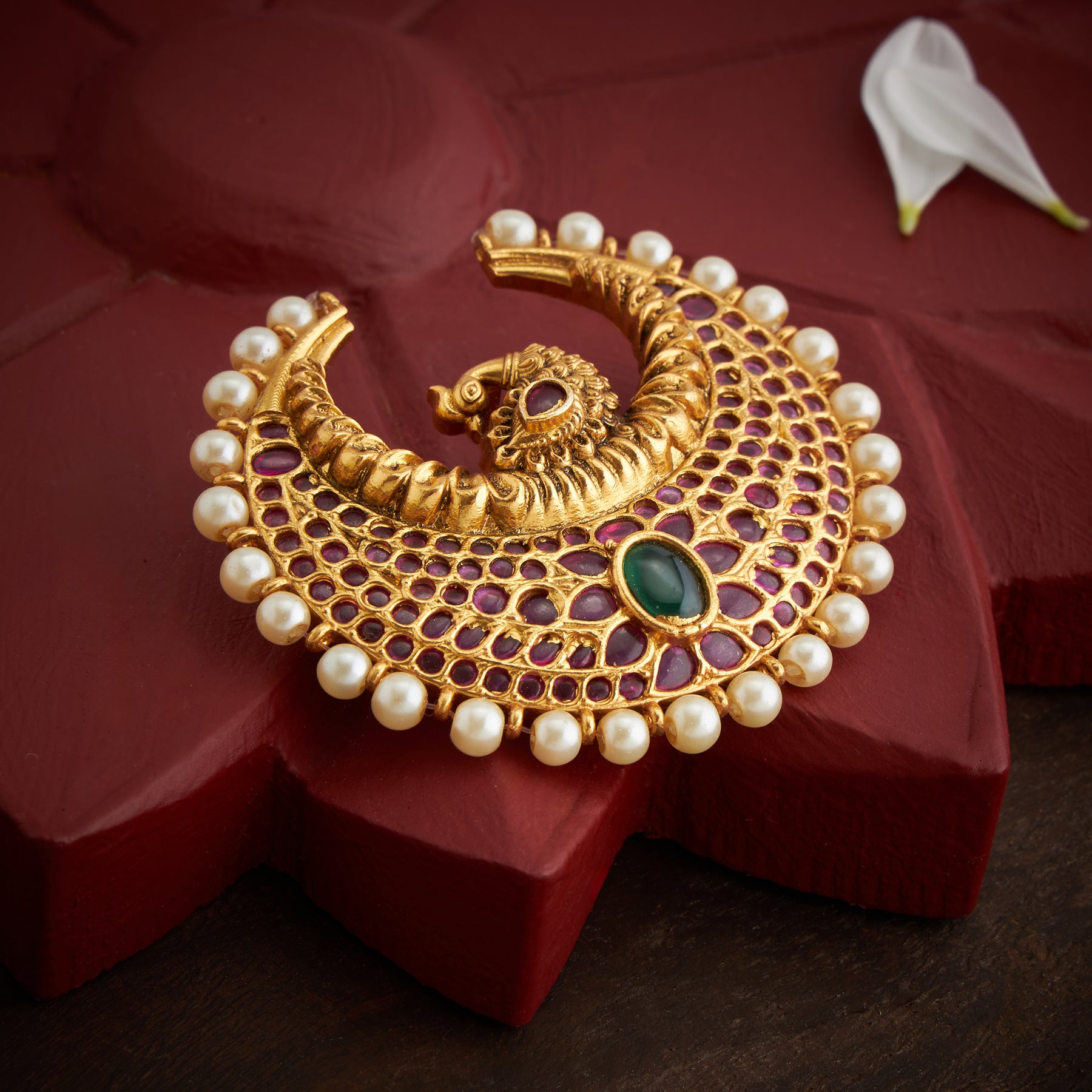 The Kundan Morika Pendant showcases exquisite craftsmanship, featuring a delicate Peacock design adorned with vibrant Emerald and Ruby stones. Accented by lustrous Pearl beads, this piece blends traditional elegance with rich color contrasts, making it a sophisticated accessory for special occasions.