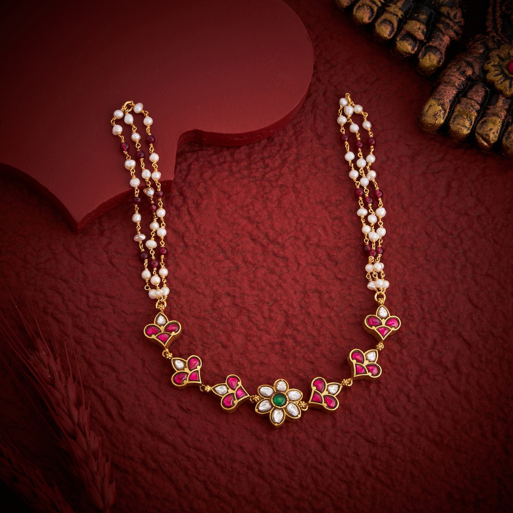 The Kundan Phool Mini Choker features an exquisite Floral design accented with traditional Kundan Settings. Enhanced with vibrant Rubies and delicately strung Pearl and Ruby Beads, this piece offers a refined blend of elegance and craftsmanship, perfect for elevating any special occasion ensemble.