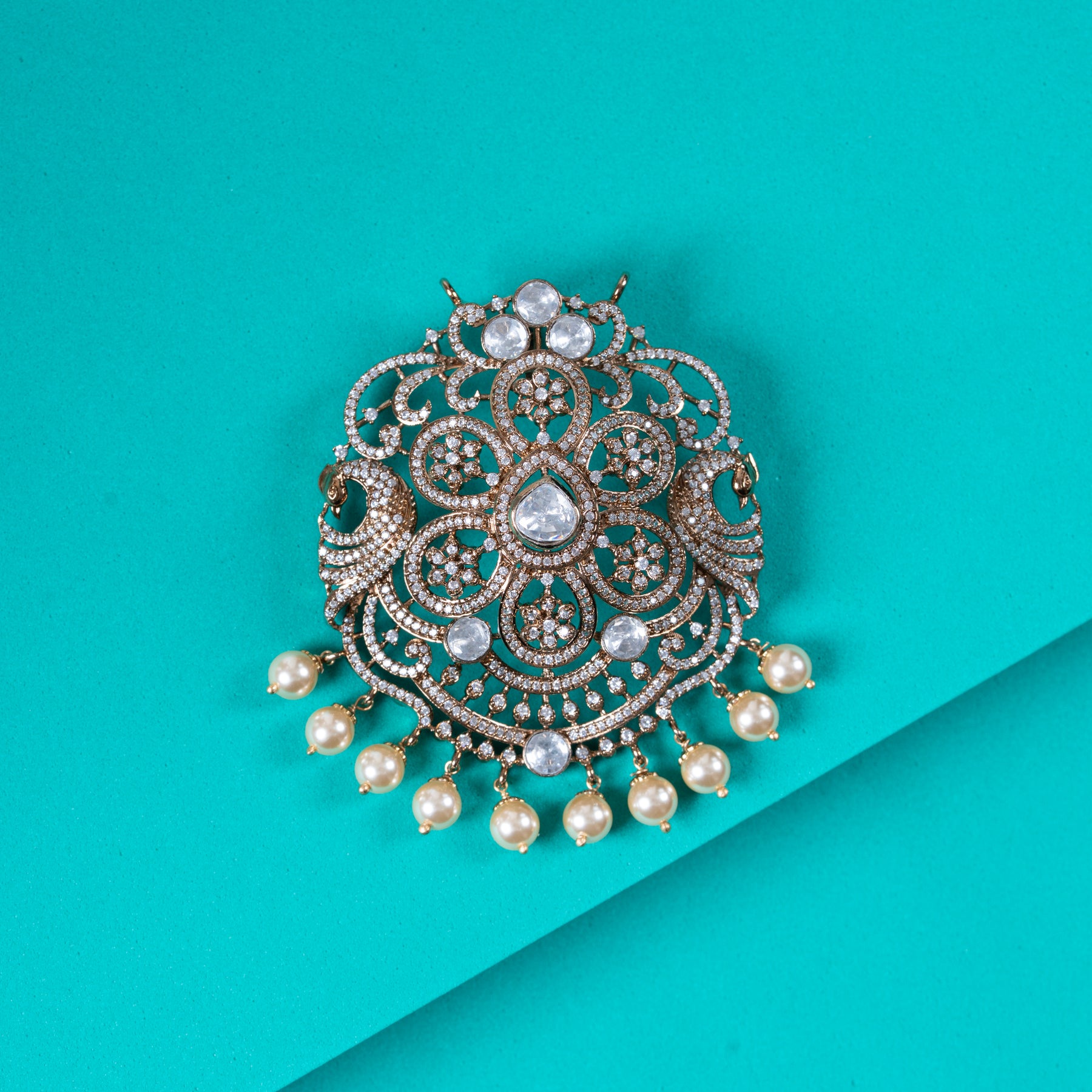 The Lustre Royale Pendant features an exquisite design inspired by Pear, delicate Floral, and elegant Peacocks, showcasing expert craftsmanship. Adorned with sparkling Moissanite and Cubic Zirconia stones, it offers exceptional brilliance and clarity. The pendant is further enhanced with graceful Pearl hangings, adding a touch of sophistication and movement. This piece seamlessly blends artistic detail with timeless elegance, making it a refined choice for those seeking a statement accessory with intricate beauty.