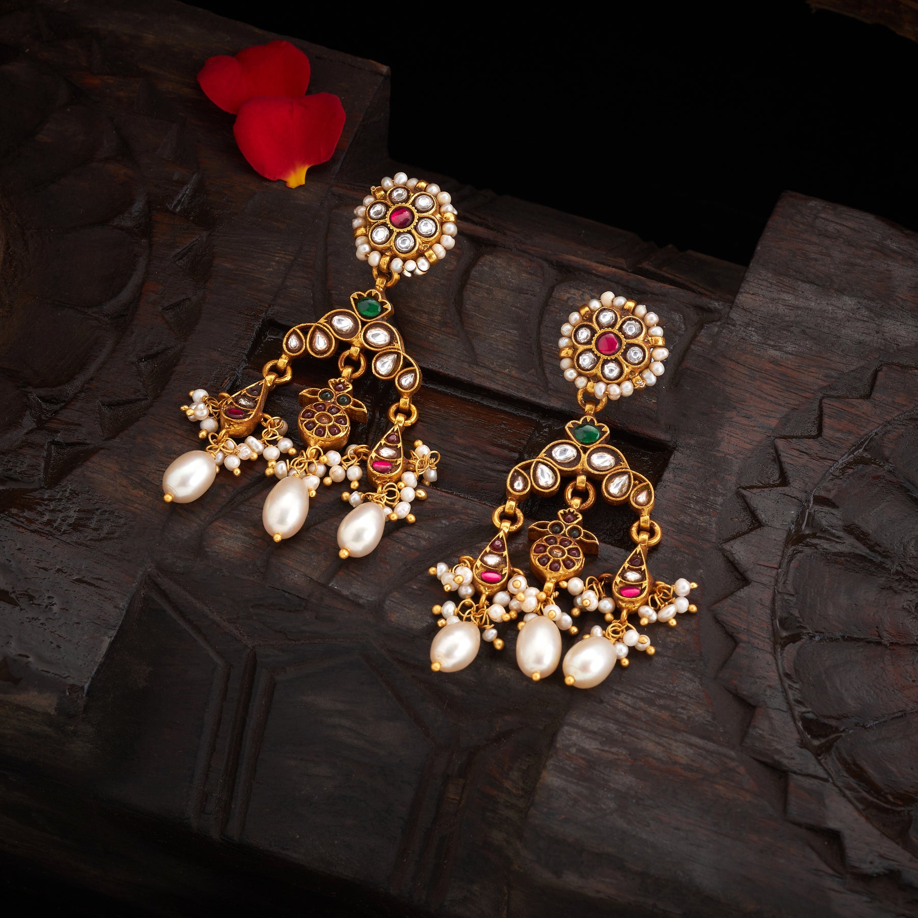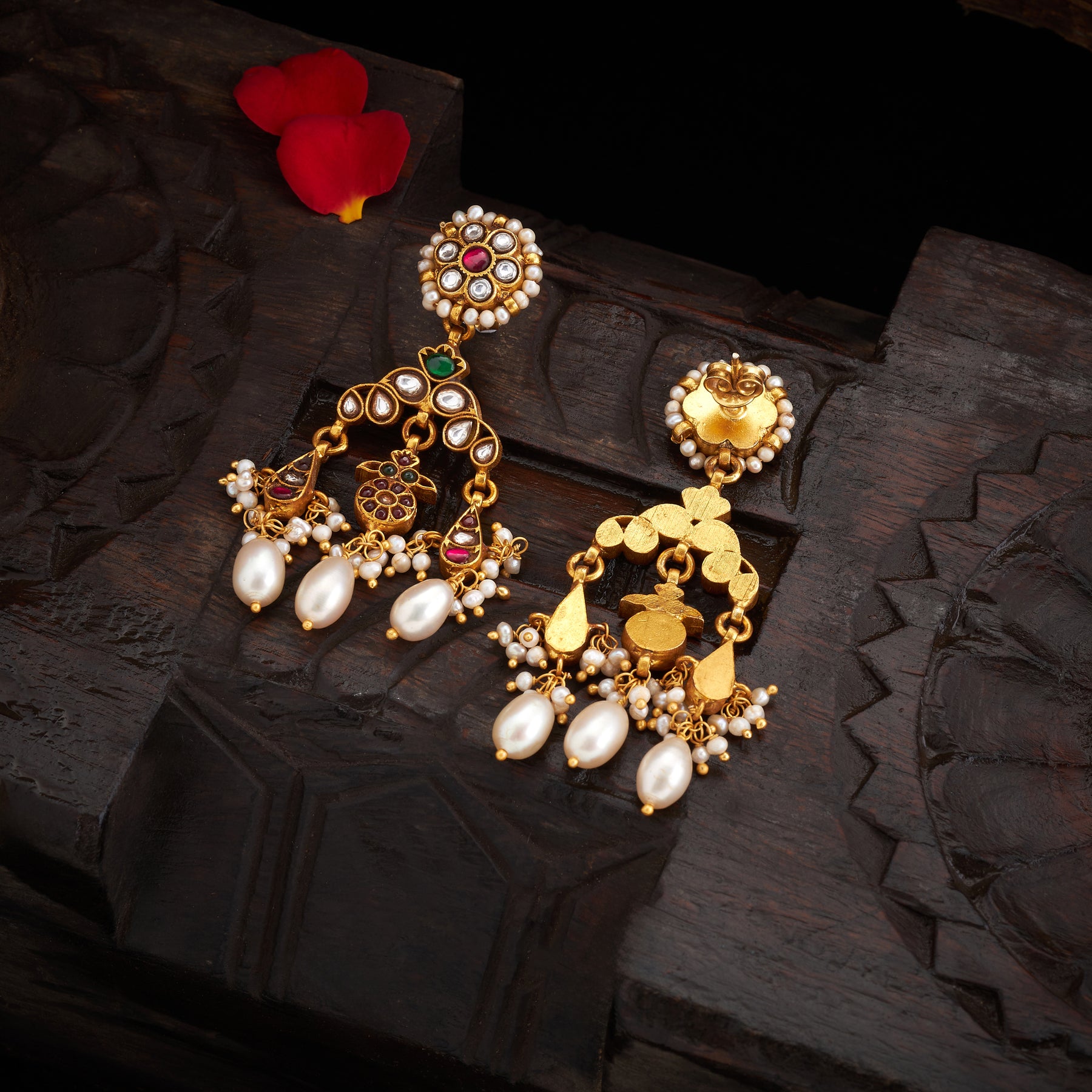 Mahalaya Pushpa Danglers showcase exquisite craftsmanship with a Floral design meticulously adorned in traditional Kundan Settings. Accented by vibrant Rubies and Emeralds, these earrings exude timeless elegance. Delicate Pearl Drops add a refined finish, enhancing their graceful movement. Perfect for elevating formal occasions, they blend classic artistry with luxurious details.