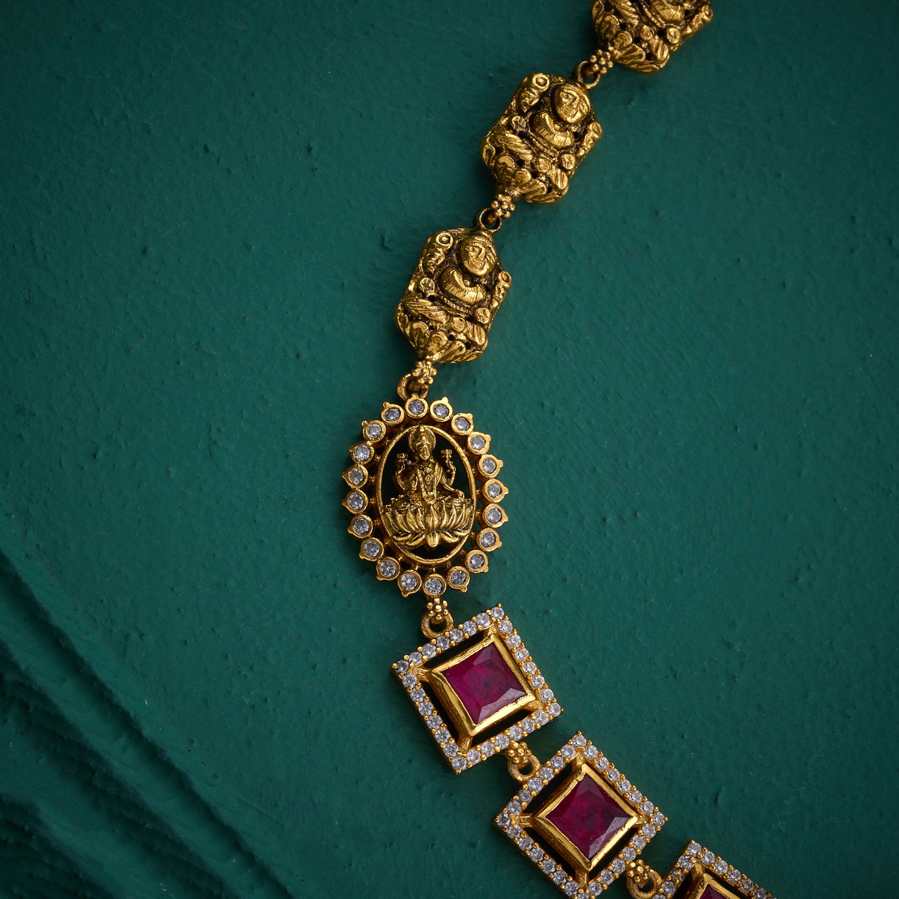 Experience the divine beauty of Marakata Lakshmi necklace. Crafted with intricate details and adorned with CZ stones, Emeralds, Rubies, and Golden Beads, this necklace showcases the elegance and grace of Goddess Lakshmi. Perfect for capturing attention and radiating abundance.