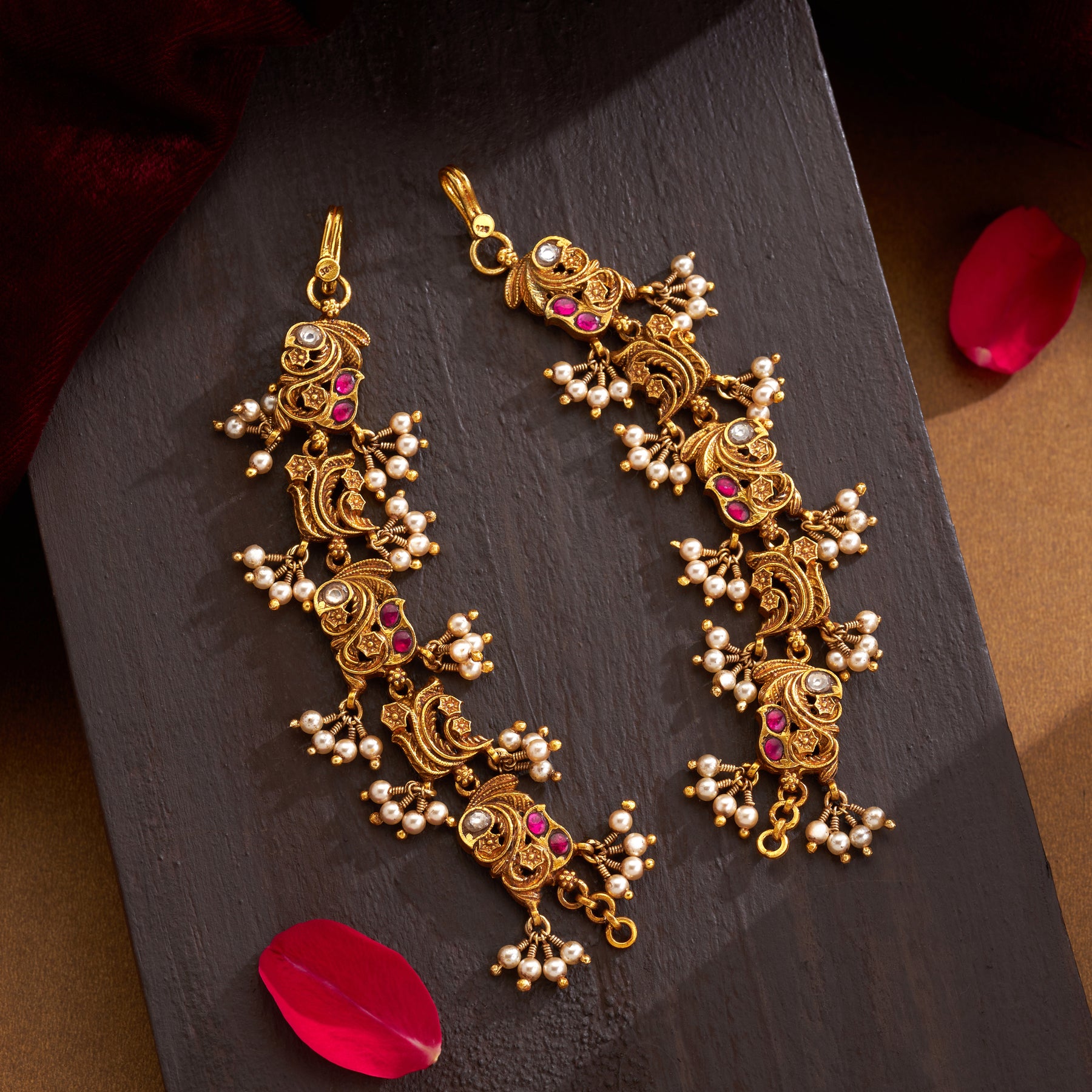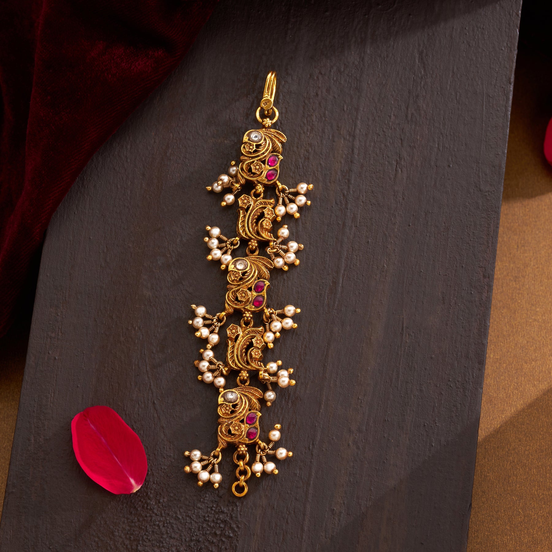 The Vajra Mor Matil pendant features an elegant Peacock design, skillfully adorned with Kundan-set Rubies that highlight its vibrant beauty. Complemented by delicate Pearl hangings, this piece blends traditional artistry with refined charm, making it a standout addition to any collection.