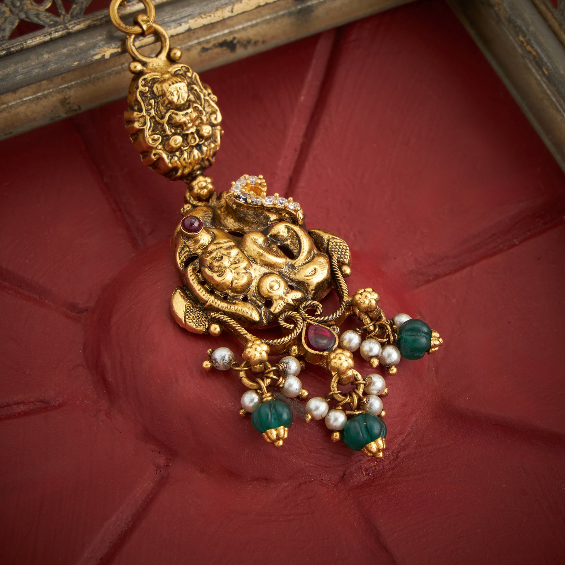 The Mayura Kshi Tikka showcases an exquisite Peacock design, elegantly adorned with delicately carved Emerald hangings and lustrous Pearls. This piece combines traditional craftsmanship with refined aesthetics, making it a distinguished accessory that enhances any ensemble with a touch of regal charm and timeless beauty.