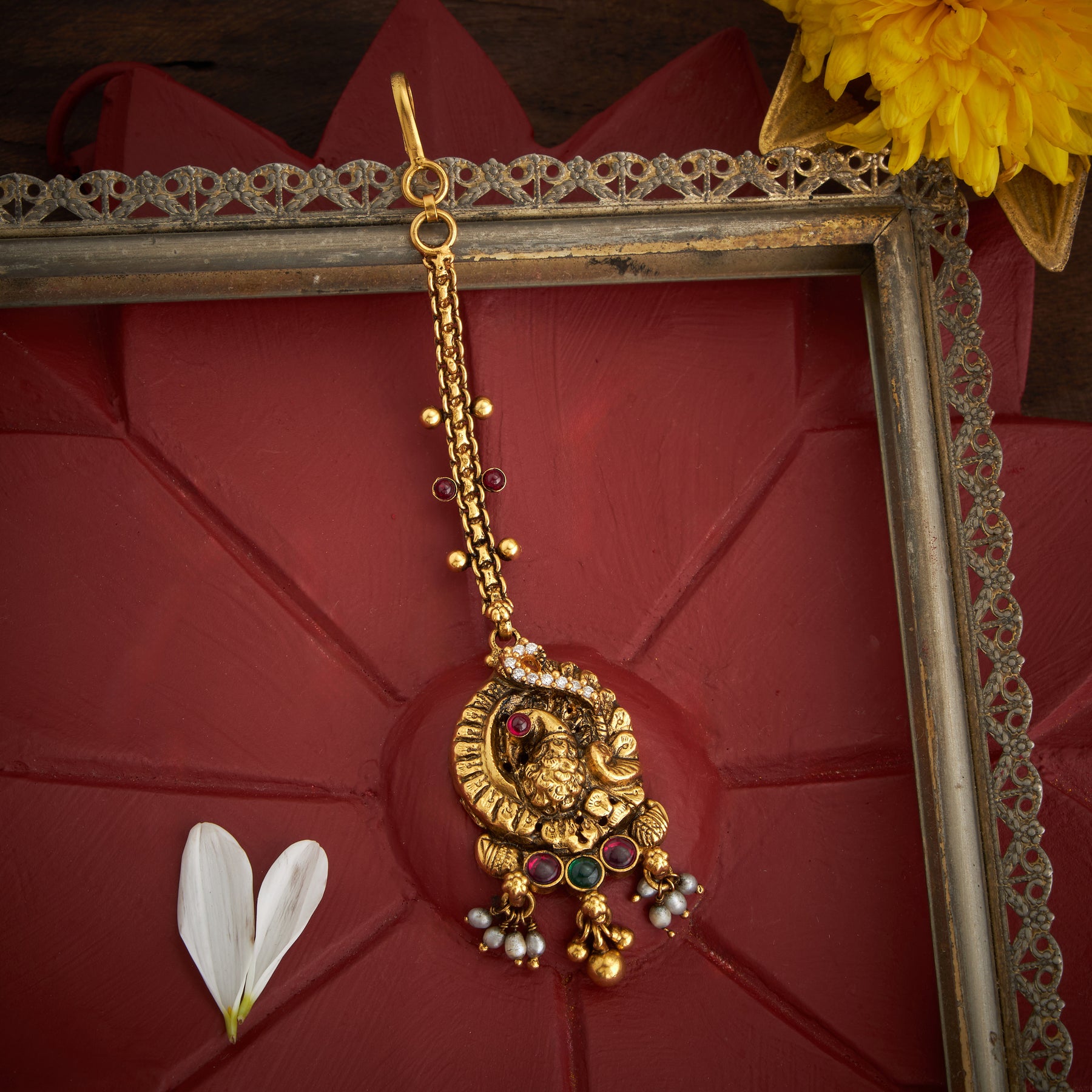 The Mayura Shringar Tikka showcases an exquisite Peacock motif, beautifully crafted with radiant Kundan stones. Adorned with delicate hangings of Golden Beads and lustrous pearls, this tikka merges traditional artistry with sophisticated elegance, making it a perfect statement piece for special occasions.