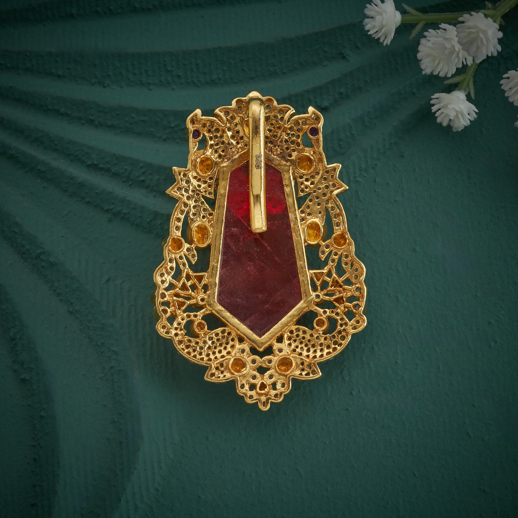 This Meadow Muse Pendant is a true work of art, featuring intricately designed Elephants and Peacocks. The stunning centre stone Emerald, a combination of sparkling CZ stones, Emeralds, and Moissanite, makes for a bold and elegant statement. Own a piece of nature's majestic beauty with this pendant.