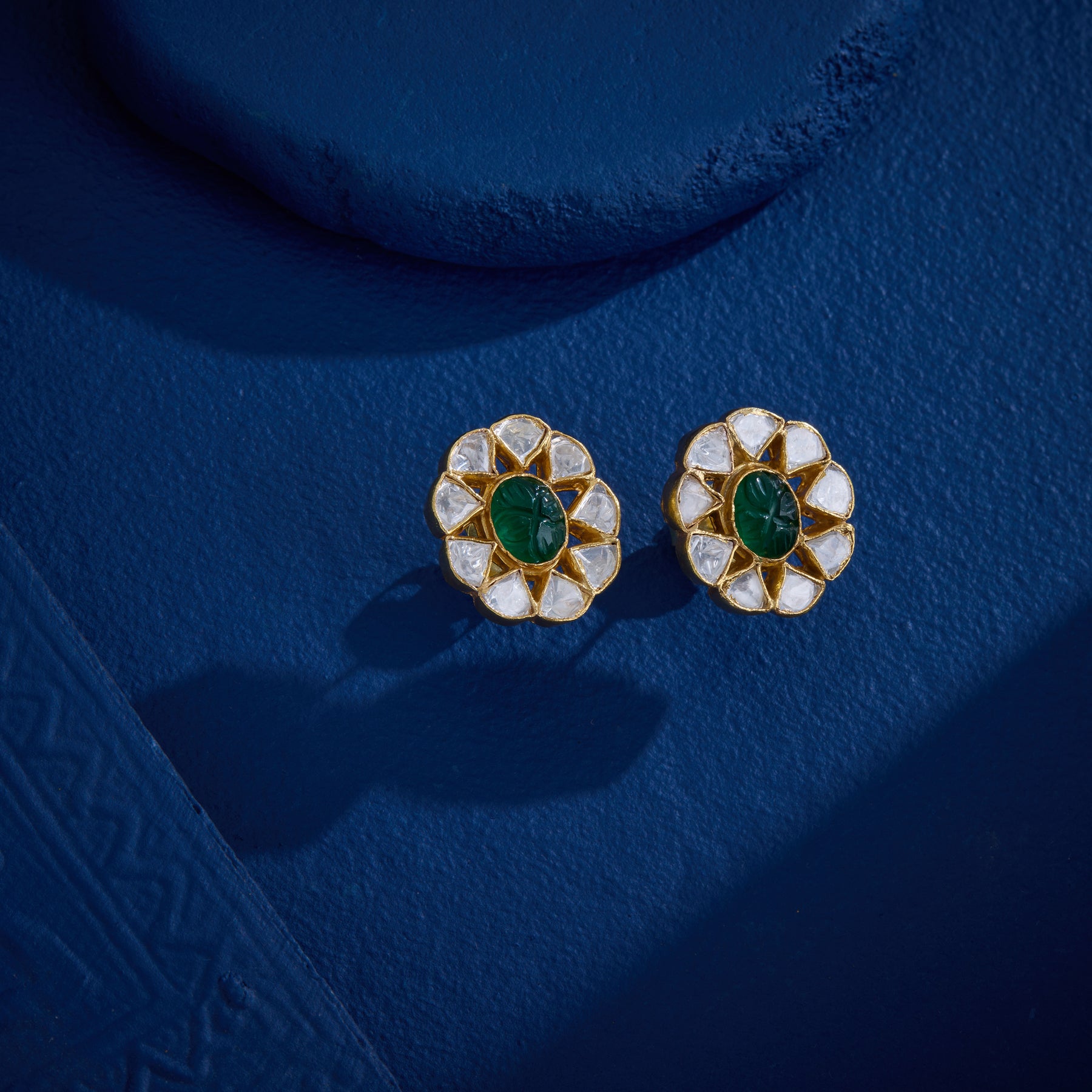 The Meera Pushp Choker showcases expert craftsmanship with its intricately carved emerald centrepiece, complemented by sparkling Moissanite settings that enhance its brilliance. Delicate Emerald and Pearl hangings add a touch of elegance and movement, making this piece a sophisticated choice for refined taste and timeless style.