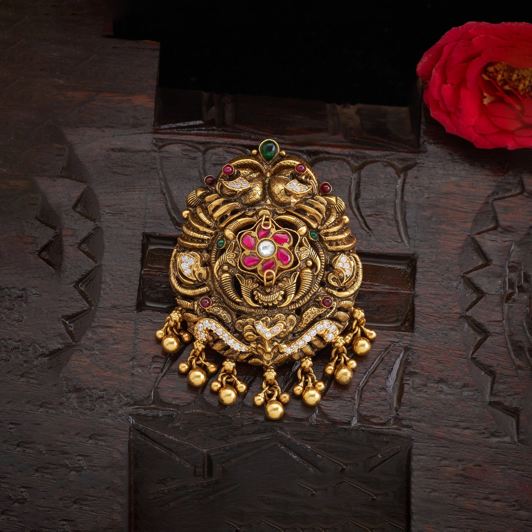 The Mithun-Mayura Pendant exemplifies exquisite craftsmanship, featuring an intricate Pair of Peacocks intertwined with delicate Floral. Adorned with Kundan-set Rubies and Cubic Zirconia stones, it captures a harmonious blend of traditional artistry and refined elegance. Golden drops add a luxurious touch, enhancing its regal appeal and making it a perfect statement piece for discerning connoisseurs of fine jewellery.